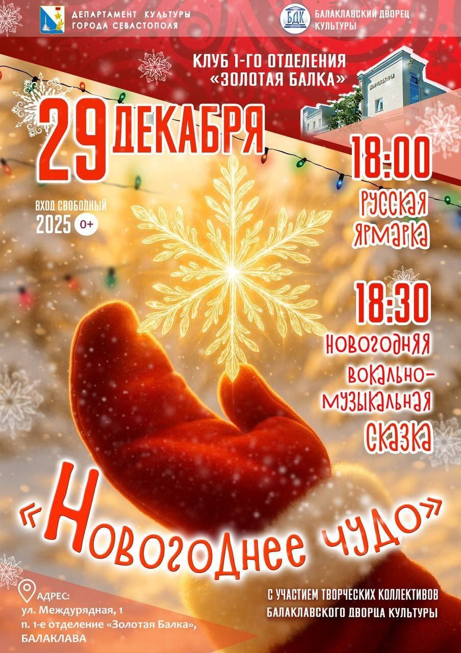 Творческие коллективы Балаклавского Дворца культуры приглашают жителей и гостей города на музыкальную программу «Новогоднее чудо».