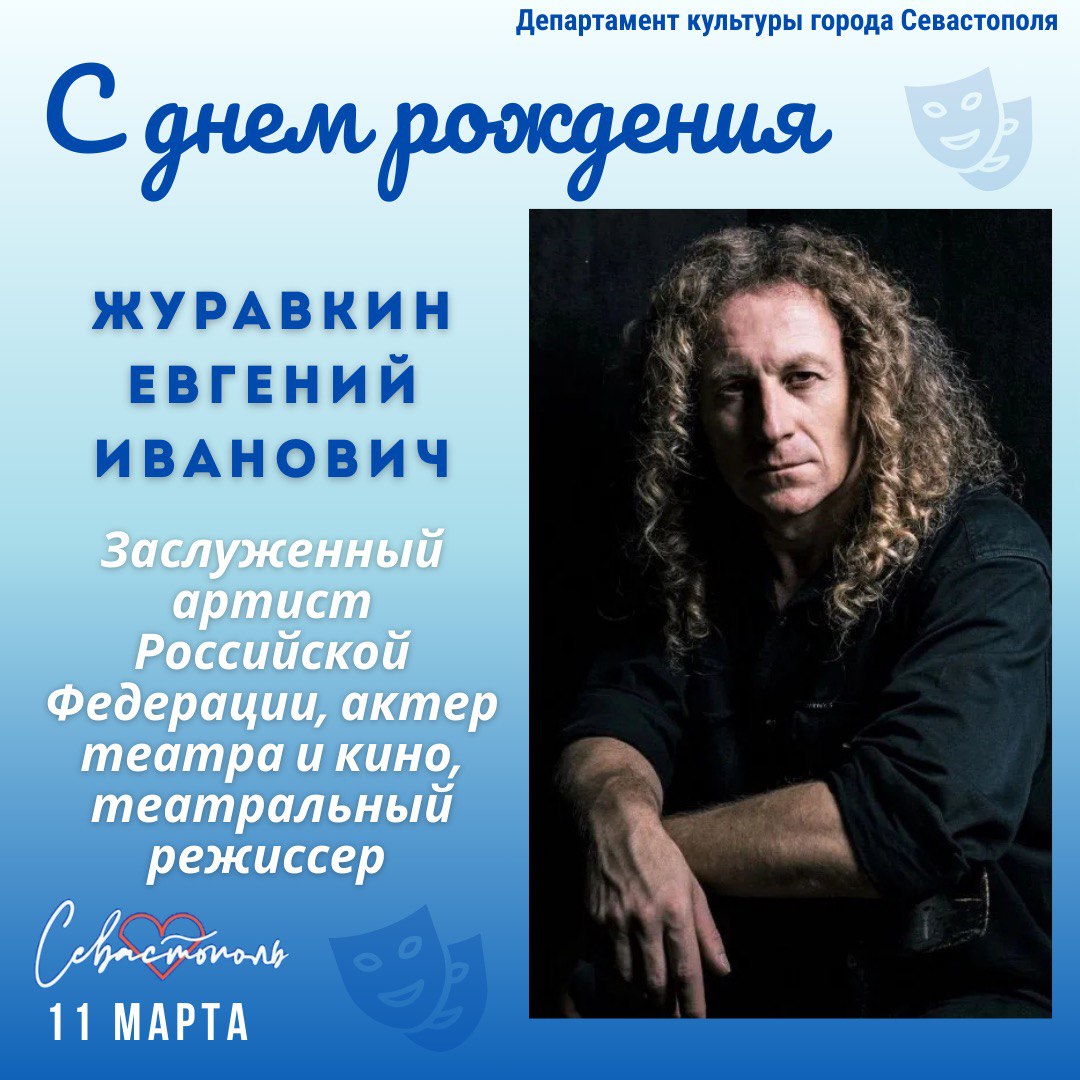Департамент культуры города Севастополя поздравляет с Днем рождения Председателя Севастопольского регионального отделения Общероссийской общественной организации «Союз театральных деятелей Российской Федерации», Заслуженного артиста Российской Федерации, актера и режиссера театра имени А.В. Луначарского Журавкина Евгения Ивановича