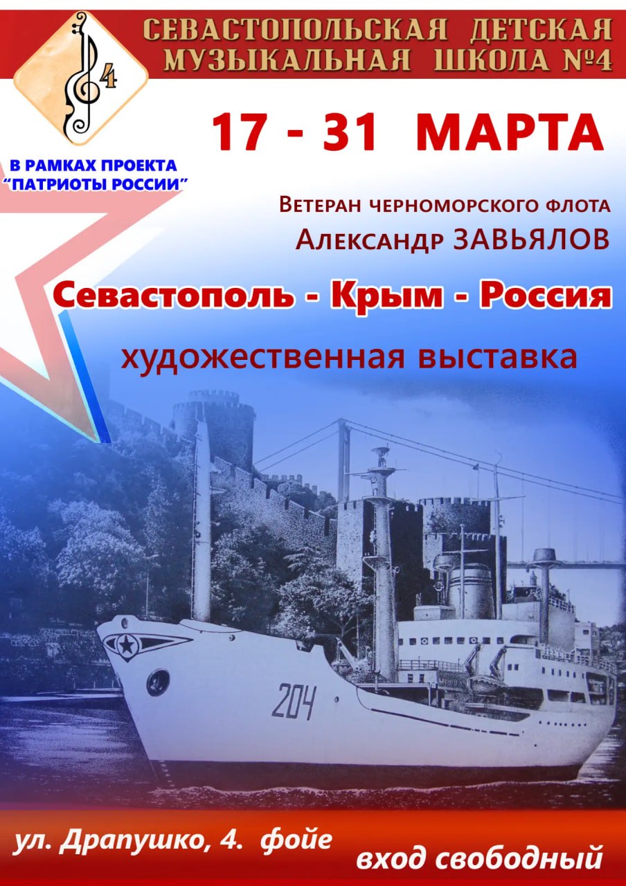 Приглашаем жителей и гостей города с 17 по 31 марта посетить выставку в фойе Севастопольской детской музыкальной школы № 4 (Балаклава, ул. Драпушко, 4). Вход свободный. При себе необходимо иметь паспорт для предъявления на входе.