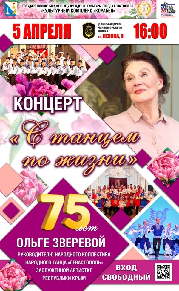 5 апреля в Доме офицеров Черноморского флота состоится юбилейный концерт «С танцем по жизни», посвященный 75-летию руководителя Народного ансамбля народного танца «Севастополь» Ольги Зверевой.