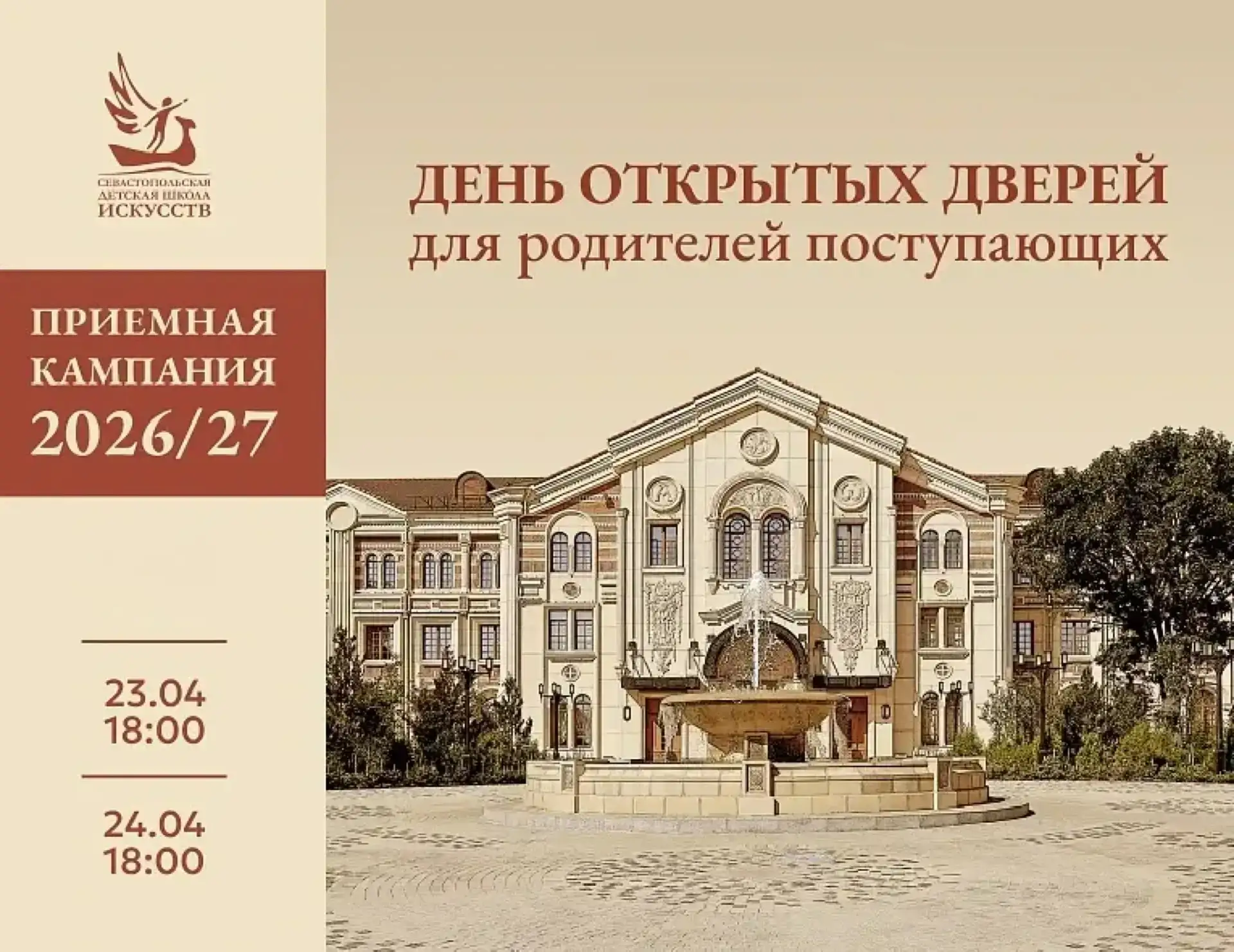 Севастопольская детская школа искусств приглашает родителей будущих воспитанников на День открытых дверей 23 и 24 апреля в 18:00.