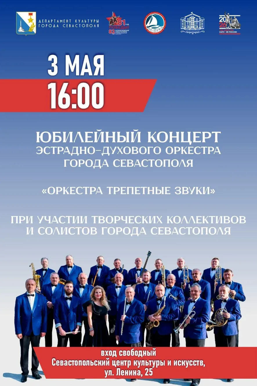 3 мая в Севастопольском центре культуры и искусств состоится юбилейный концерт Эстрадно-духового оркестра города Севастополя «Оркестра трепетные звуки». В концертной программе примут участие творческие коллективы и солисты города.