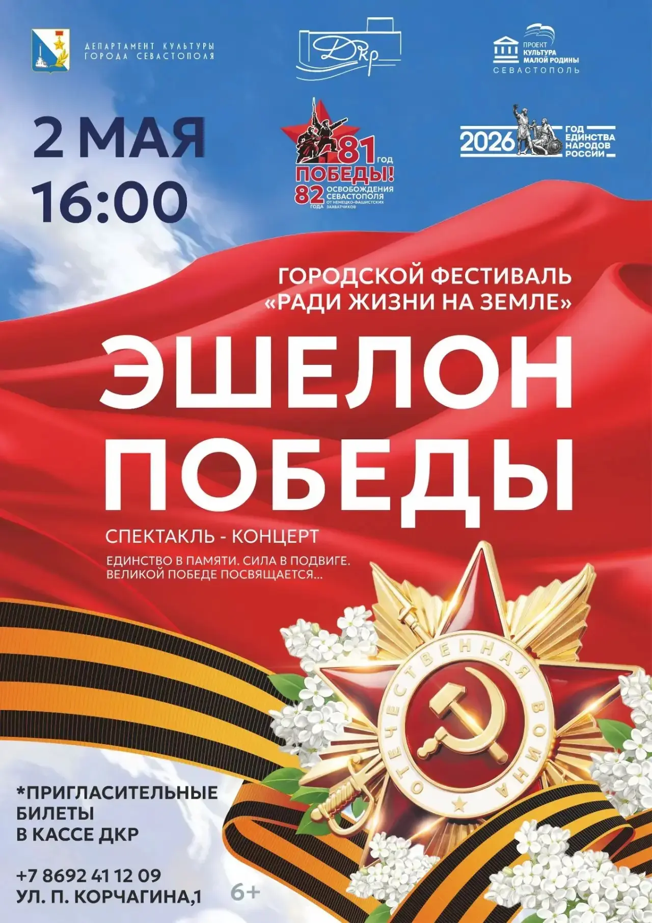 Приглашаем жителей и гостей Севастополя 2 мая в 16:00 в Дворец культуры рыбаков (ул. Павла Корчагина, 1). Пригласительные билеты можно бесплатно получить в кассе ДКР. Справки по телефону: +7 8692 41 12 09.