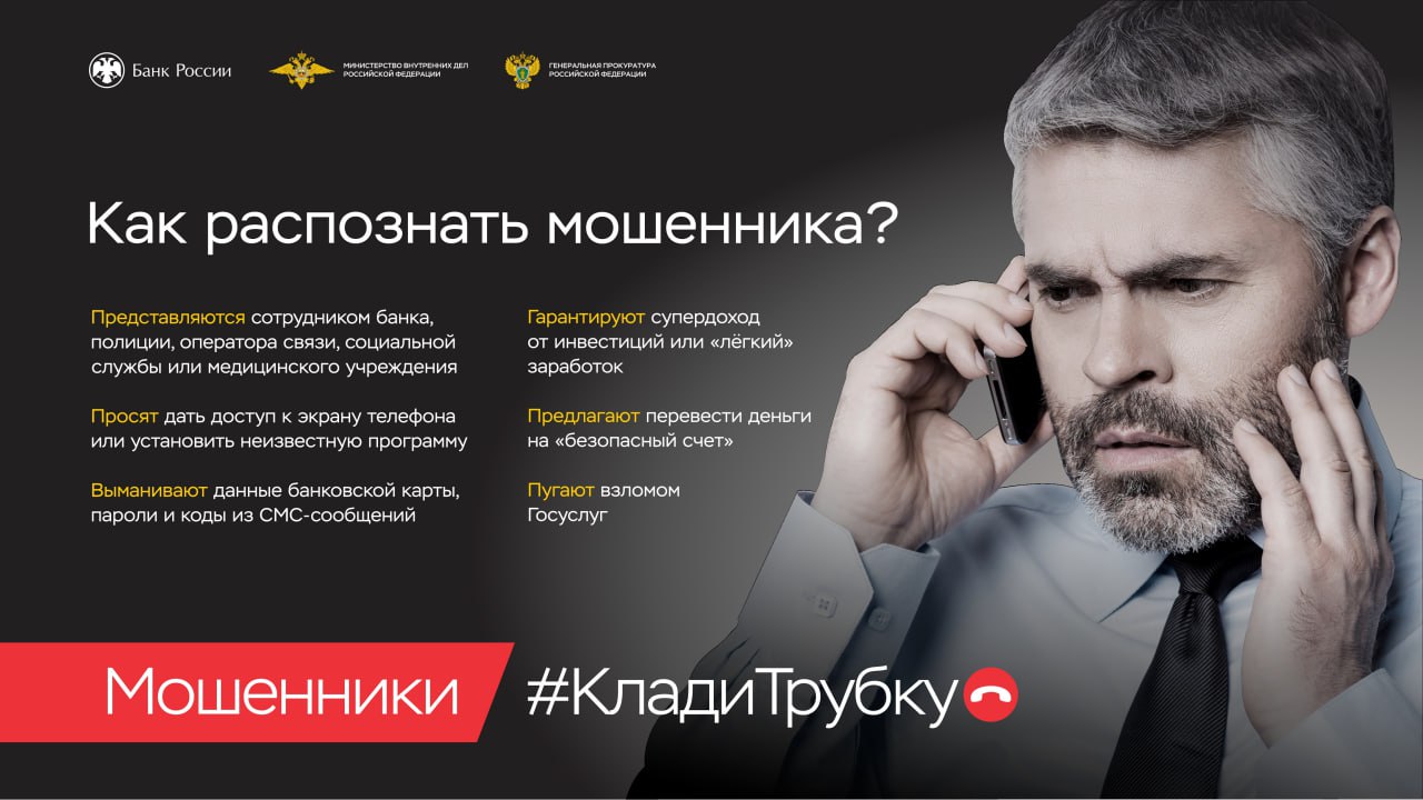 Генеральная прокуратура Российской Федерации, Минцифры, МВД России, Банк России ведут информационную кампанию по кибербезопасности «Клади трубку».