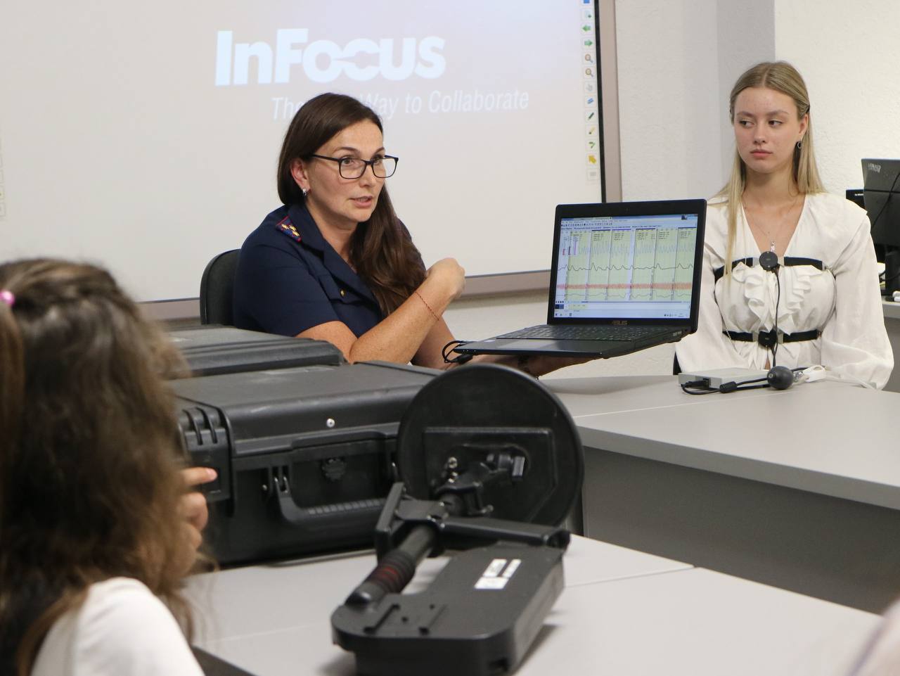 Под руководством офицеров-наставников школьники с помощью источника криминалистического света и средств индивидуальной защиты самостоятельно осмотрели территорию. Особый интерес вызвали особенности процедуры проверки на полиграфе. Наставники рассказывали ребятам – как правильно применять ту или иную технику, а также конкретные примеры из своей практики.