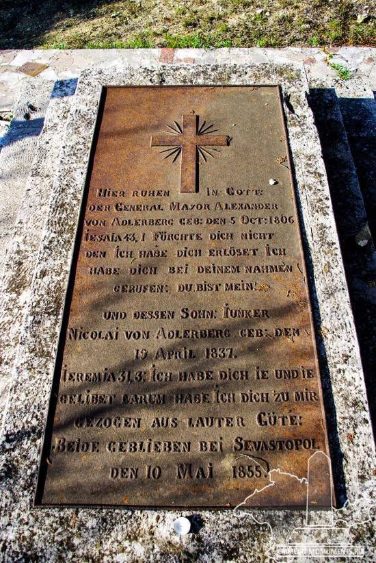 «Здесь почивают в бозе генерал-майор Александр фон Адлерберг, родился 5 октября 1806 года. И сын его юнкер Николай фон Адлерберг, родился 19 апреля 1837 года. Оба остались под Севастополем 10 мая 1855 года».