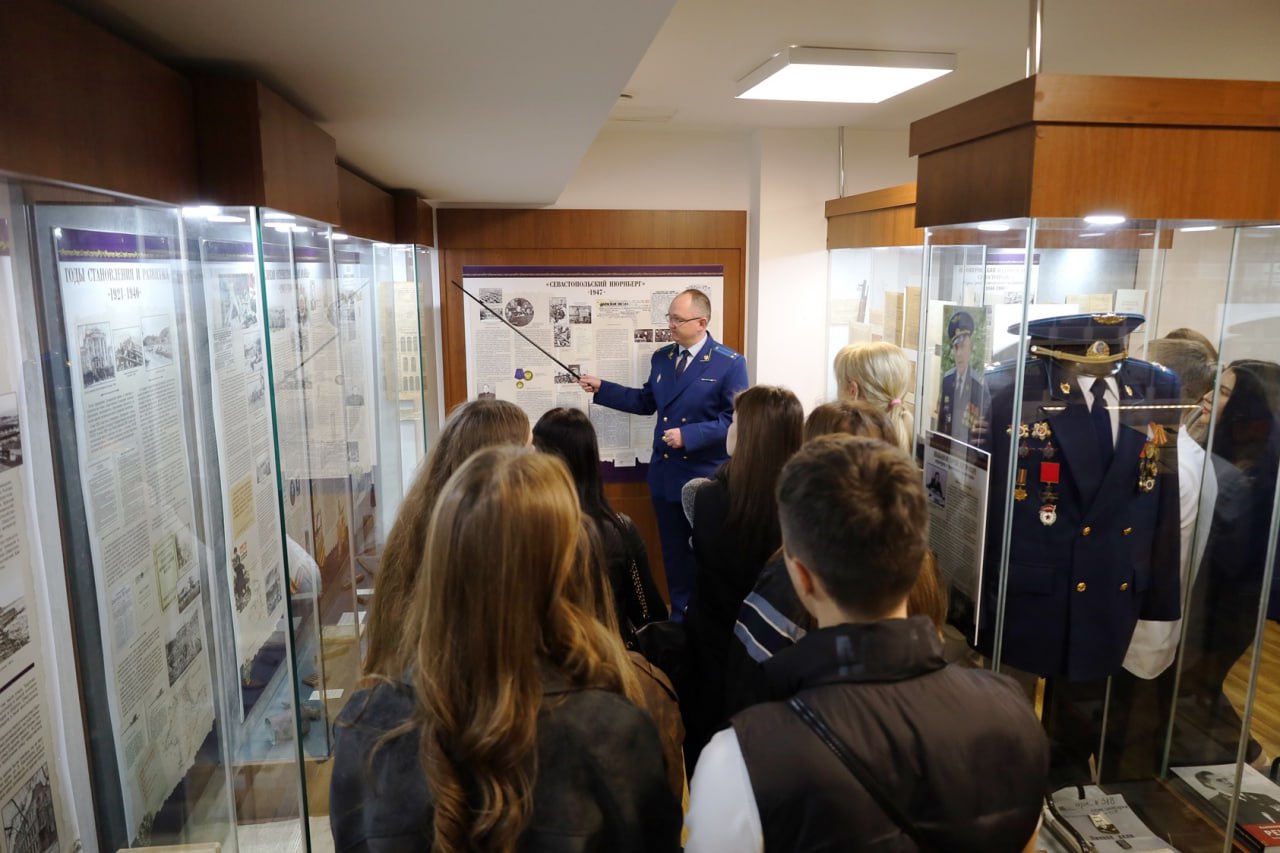 Старший помощник прокурора города Севастополя Дмитрий Потанин ознакомил студентов с экспозициями музея. В ходе экскурсии особое внимание уделено стендам, посвященным событиям Великой Отечественной войны. Также посетители подробнее узнали об истории надзорного ведомства. В музее находятся подлинные сборники законодательства первой половины XX века, обмундирование прокурорских работников разных периодов, уголовные дела и другие интересные документы, ранее хранившиеся на архивных полках.