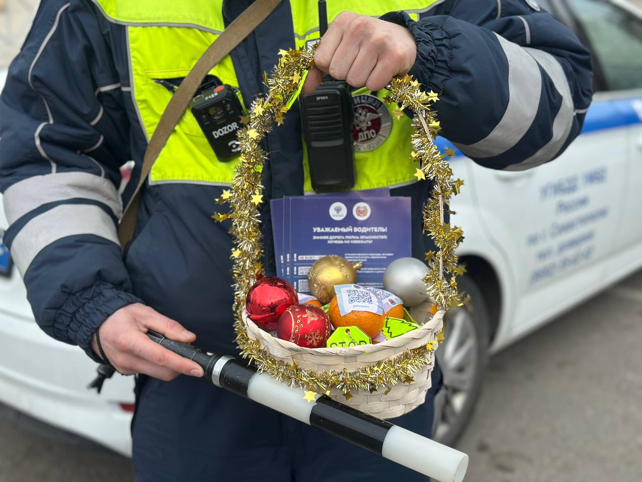 Во время акции дорожные полицейские поздравили водителей с наступающим Новым годом и напомнили о необходимости перехода на «зимний режим» - изменение стиля вождения при ухудшении погодных условий.
