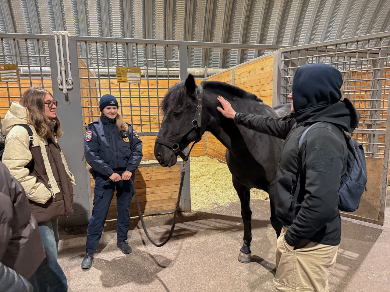 Финальным и не менее впечатляющим стало посещение кавалерийского подразделения. Сотрудники рассказали об особенностях службы и о подготовке лошадей, об их применении для патрулирования лесопарковых зон, труднодоступных территорий и обеспечения порядка во время крупных городских событий. Многие участники акции впервые смогли так близко пообщаться с благородными животными.