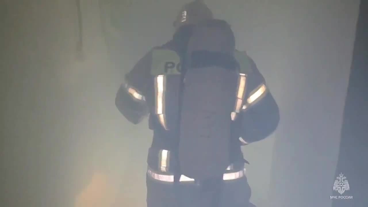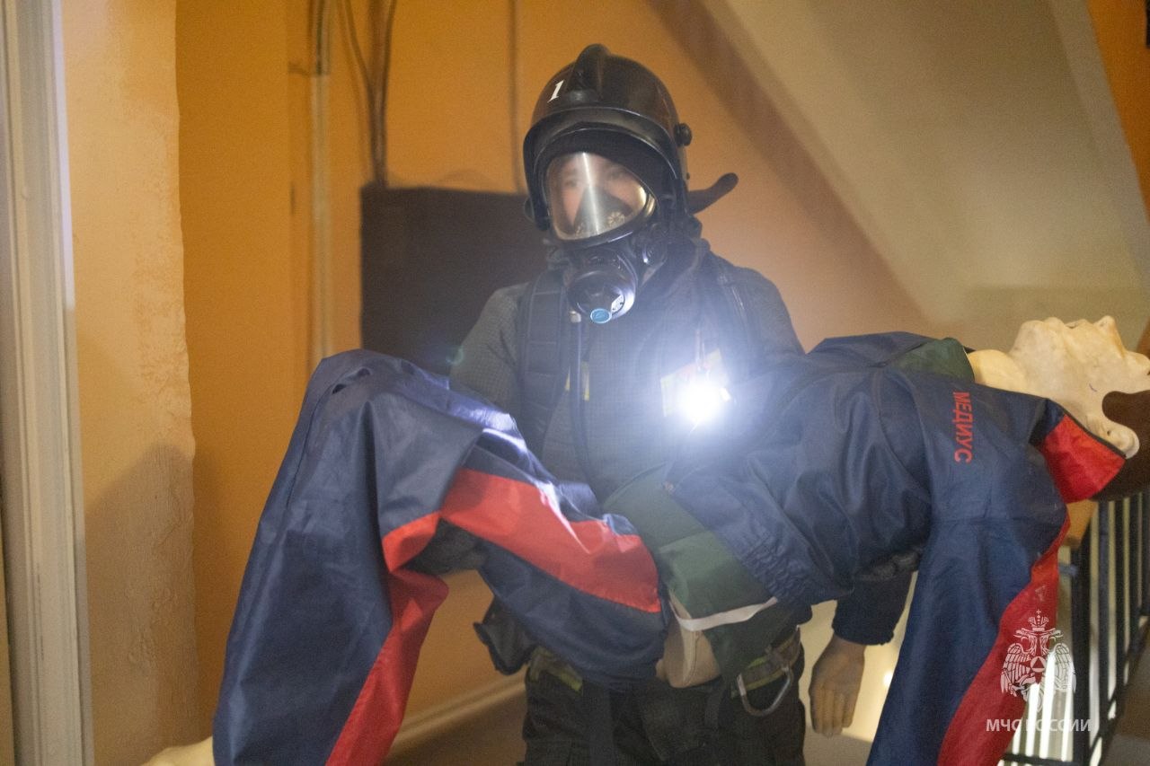 В условиях практически нулевой видимости пожарные в полной экипировке, со средствами защиты органов дыхания и зрения преодолели препятствия на маршруте и вынесли из опасной среды «пострадавшего» Арсения.