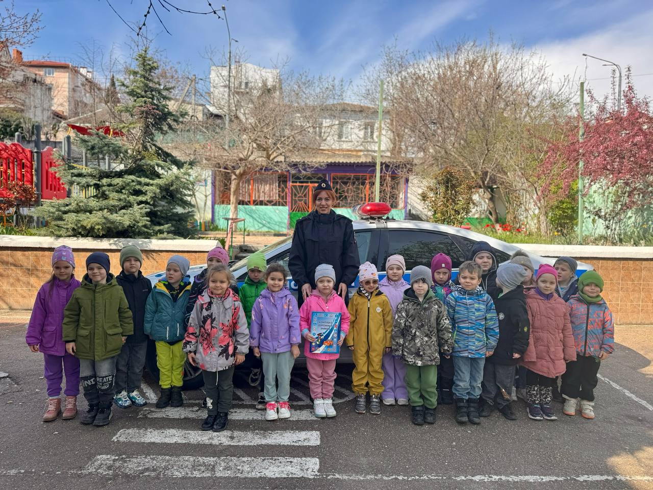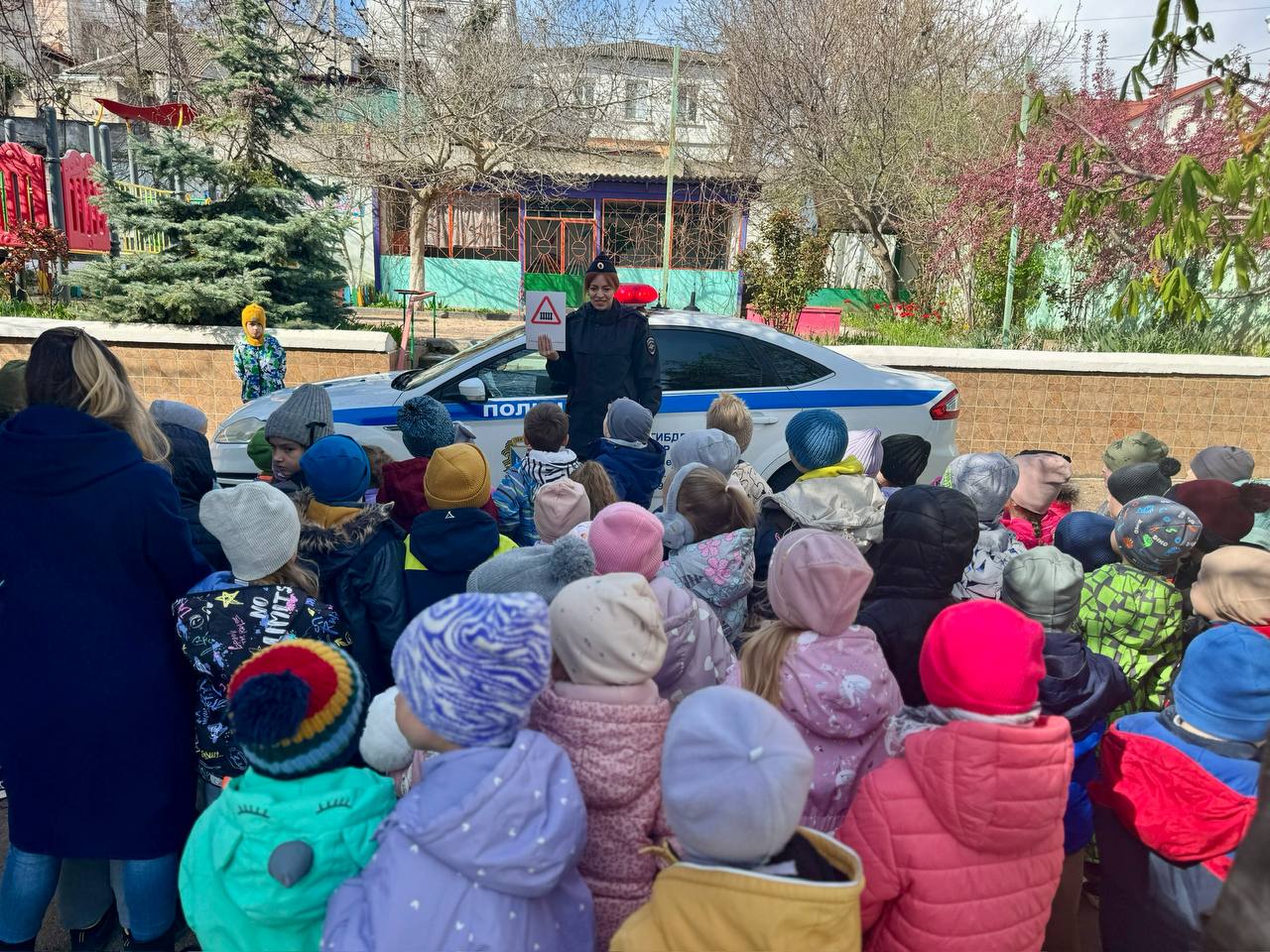 Дошкольники закрепили полученные знания, отвечая на вопросы дорожных полицейских и моделируя возможные ситуации во время беседы. Кроме того, полицейские показали ребятам оснащение патрульного автомобиля и работу сигнального громкоговорящего устройства и звуковых сигналов.