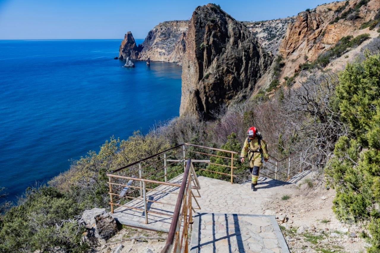 Почти полсотни огнеборцев собрались на живописном мысе Фиолент, чтобы на скорость подняться по лестнице, ведущей по скале с берега пляжа «Яшмовый». Их объединило соревнование «Легендарный вызов», организованное МЧС России по городу Севастополю.