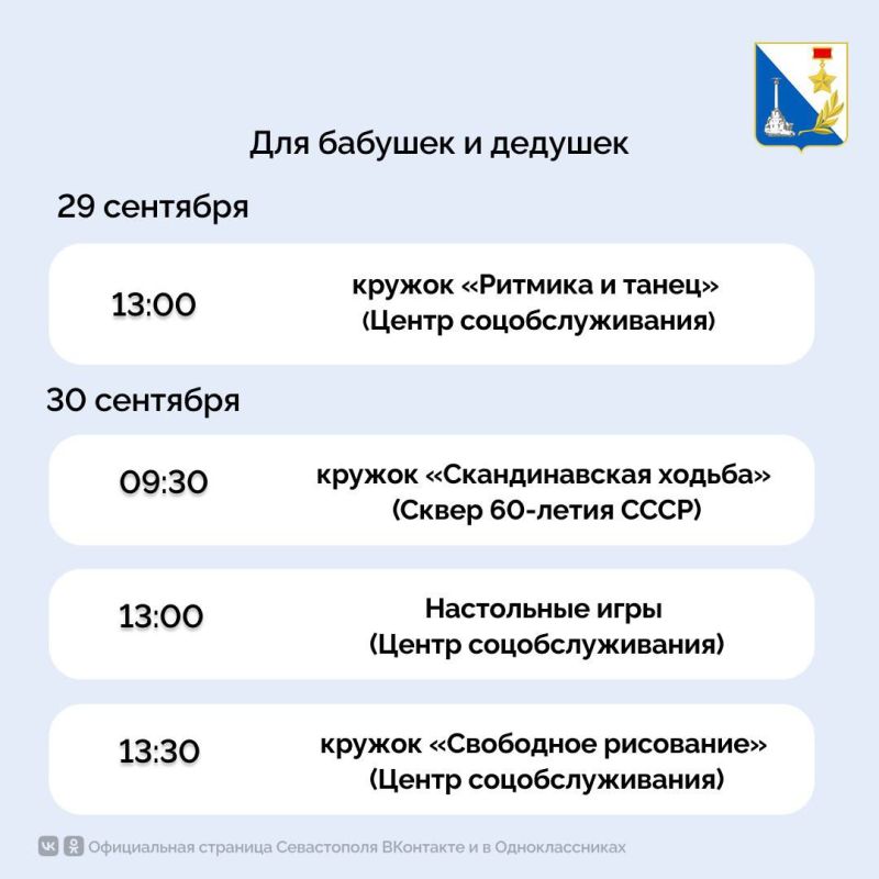 Специалисты Севастопольского центра социального обслуживания подготовили бесплатные мероприятия на следующую неделю.В карточках — расписаниеНе забудьте предложить своим бабушкам и дедушкам присоединиться к занятиям!Подписывайтесь...