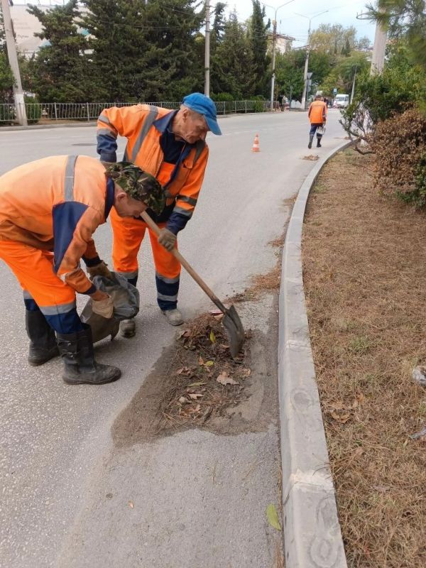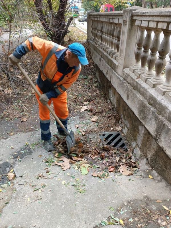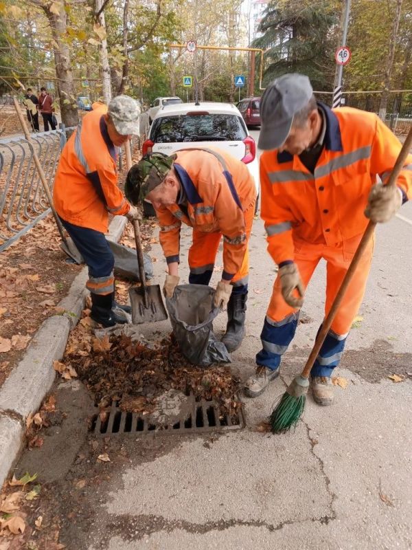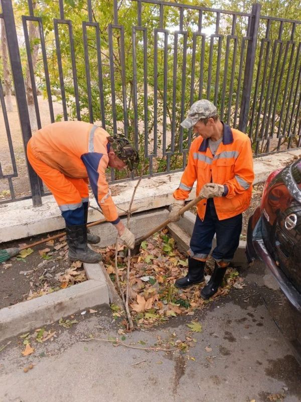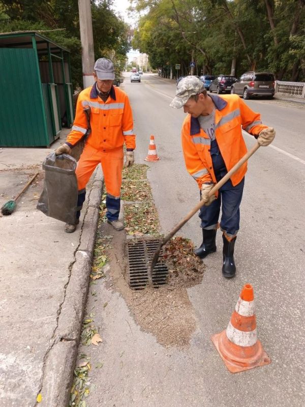 Водоканал: Рабочие моменты. Бригада ливневой канализации устраняет последствия ливня - удаляет с решеток дождеприемников нанесенную водой листву Фото Александра Дудкина на ул.А.Кесаева, ПОР, пр.Ю.Гагарина, пл.50-летия СССР...