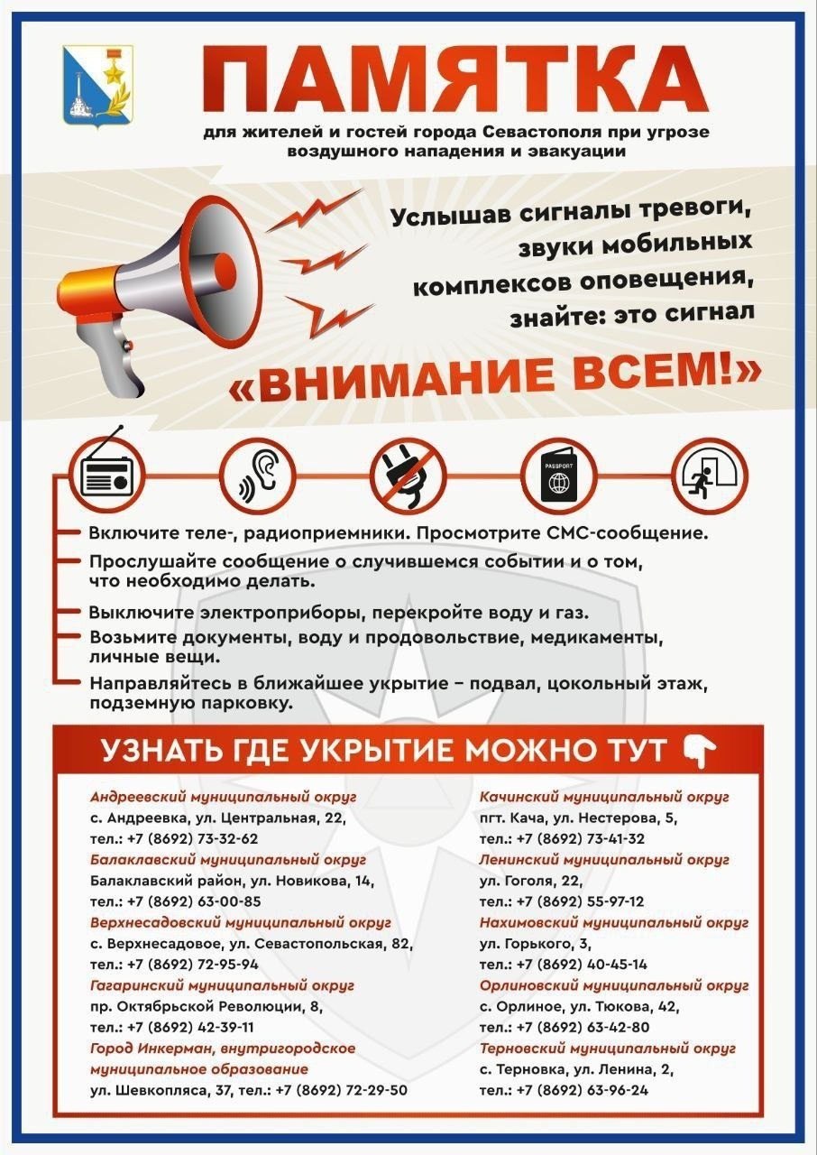 При поступлении сигнала «Внимание Всем!», «Воздушная тревога», «БАЛЛИСТИКА» полагается сохранять спокойствие , соблюдать меры безопасности , укрыться в ближайших помещениях или укрытиях, держаться подальше от окон. Главное - не находиться на открытом пространстве. Основную опасность представляют осколки.