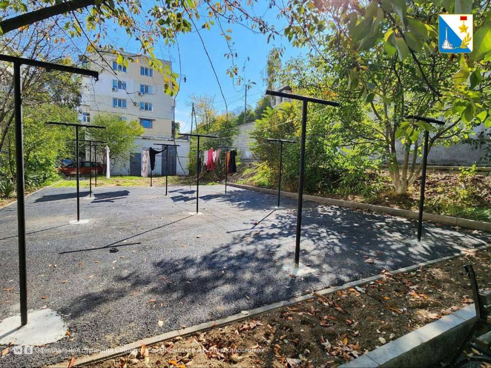 На территории обустроили современную зону для сушки белья с 12 стойками, установили 4 скамейки и заасфальтировали парковочную зону.