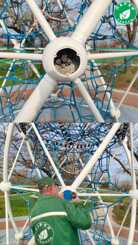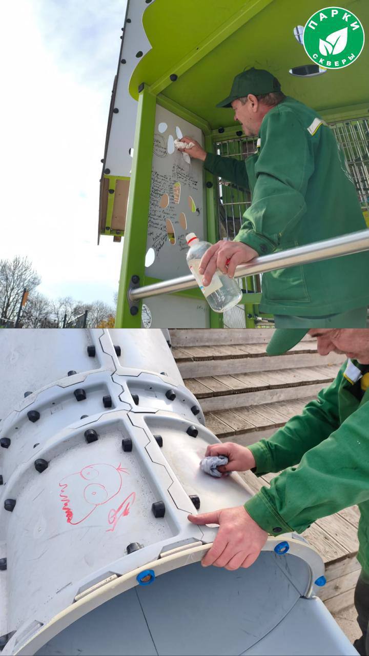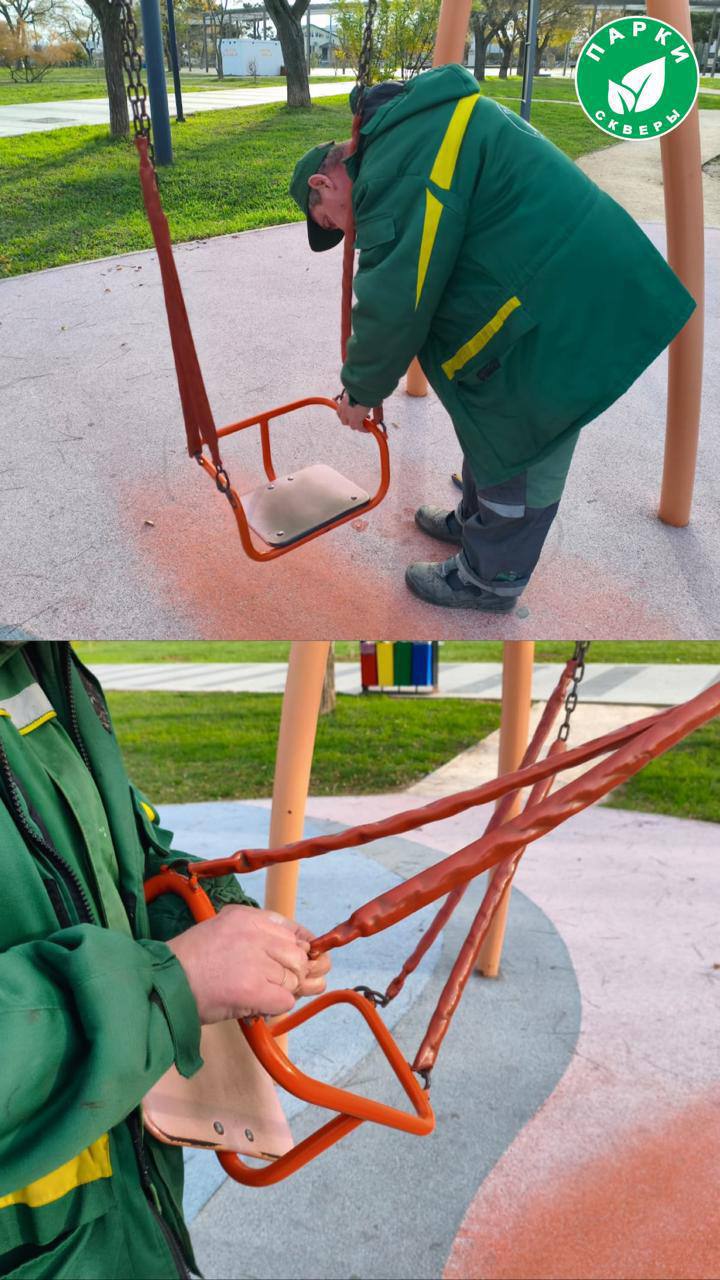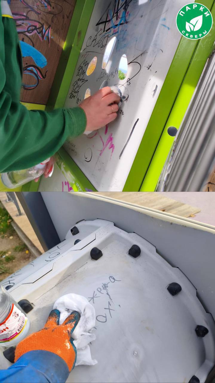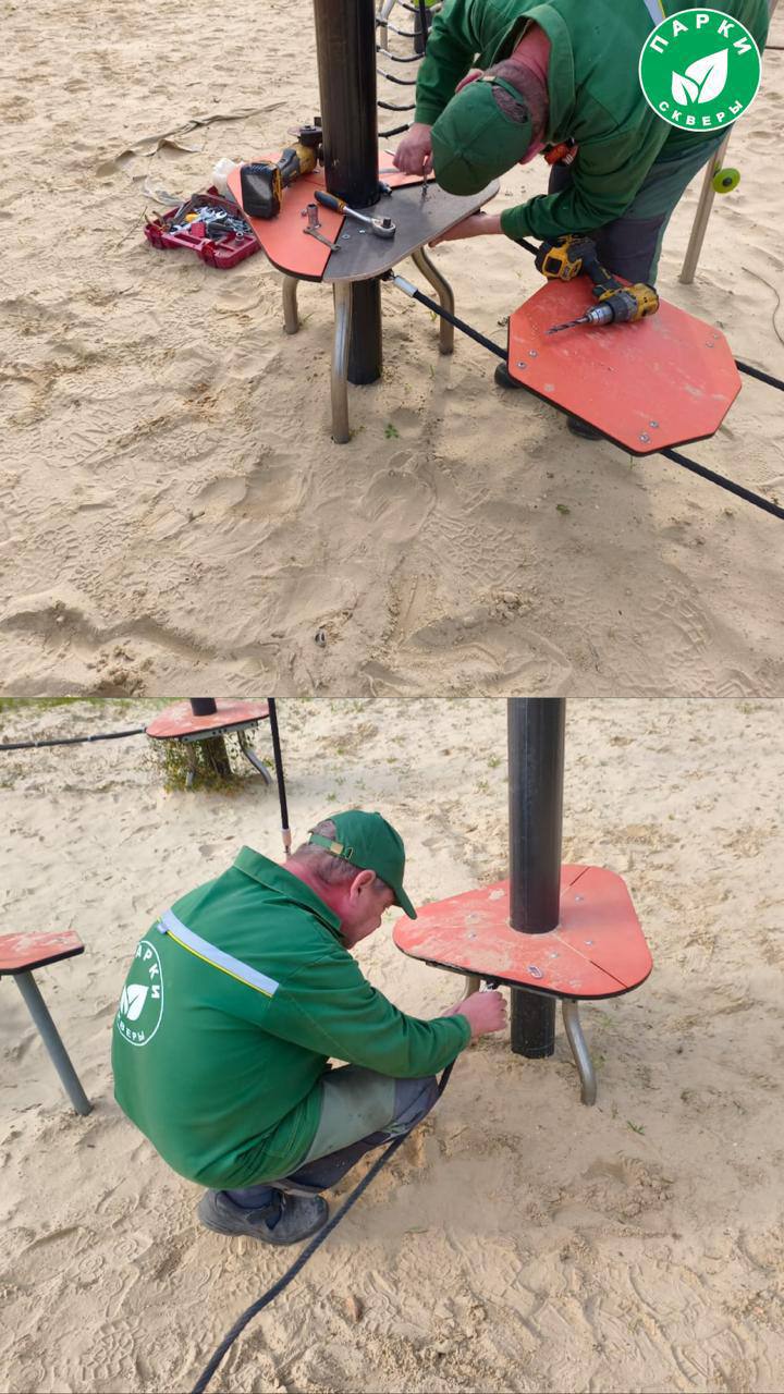 Удалили рисунки и граффити с игровых и спортивных объектов, выполнили ремонт крепежных элементов качелей и крепежа канатов на игровых комплексах для обеспечения безопасной эксплуатации.