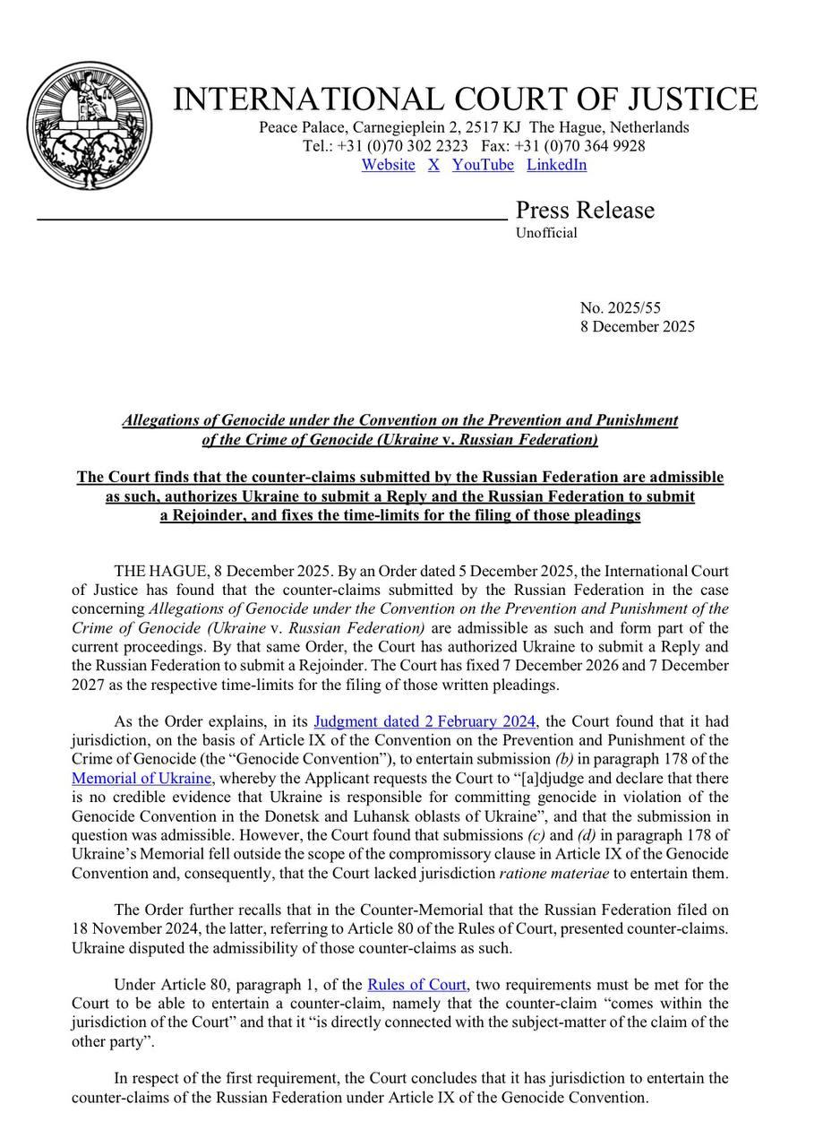 Тем временем, украинская перемога с судом над Россией предсказуемо превратилась в зраду. Международный суд ООН принял встречный иск России против Украины по обвинению последней в геноциде. Российской стороне дали время до 7 декабря 2027 года, чтобы представить свои аргументы.