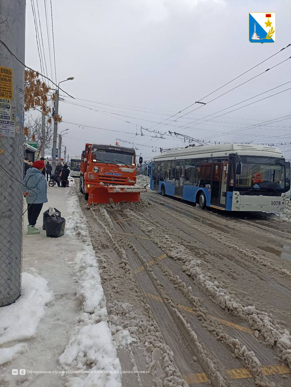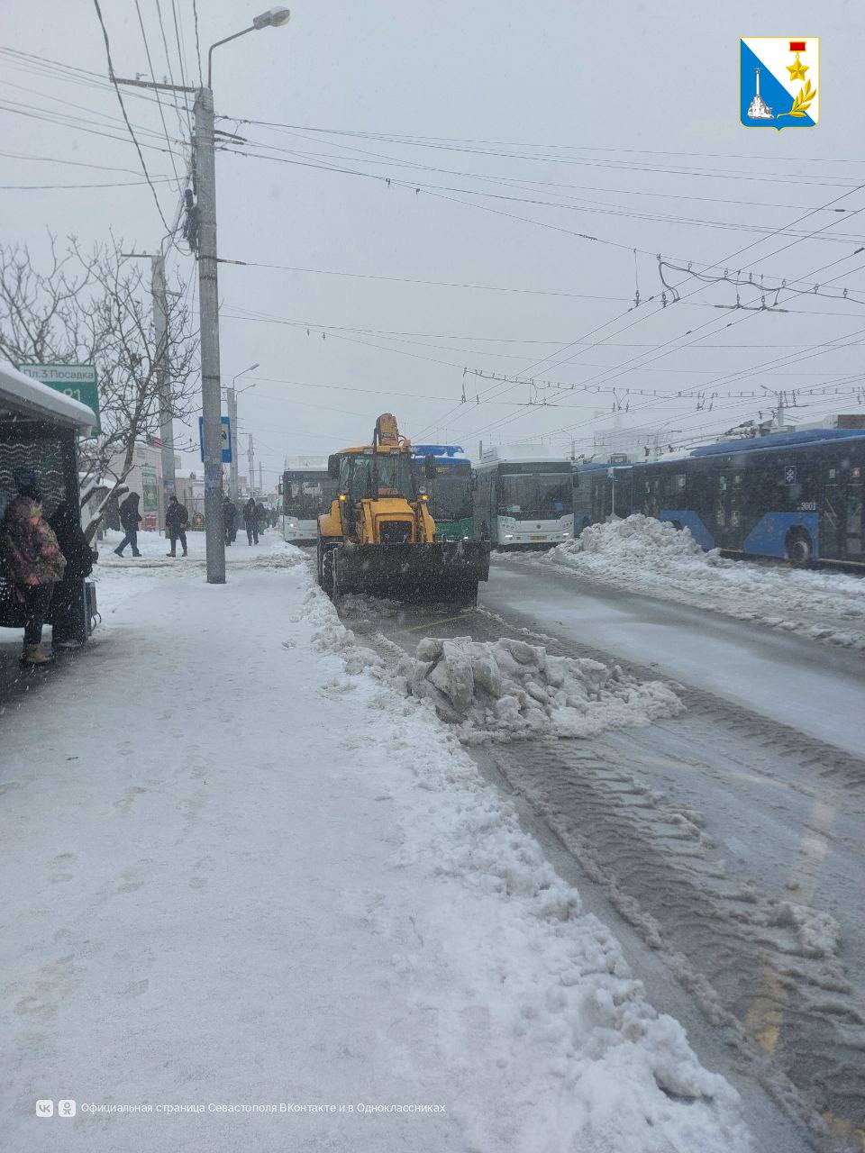 На кадрах — уборка пересадочного пункта на 5-м километре Балаклавского шоссе. Дорожники также убирают снег у остановок общественного транспорта.