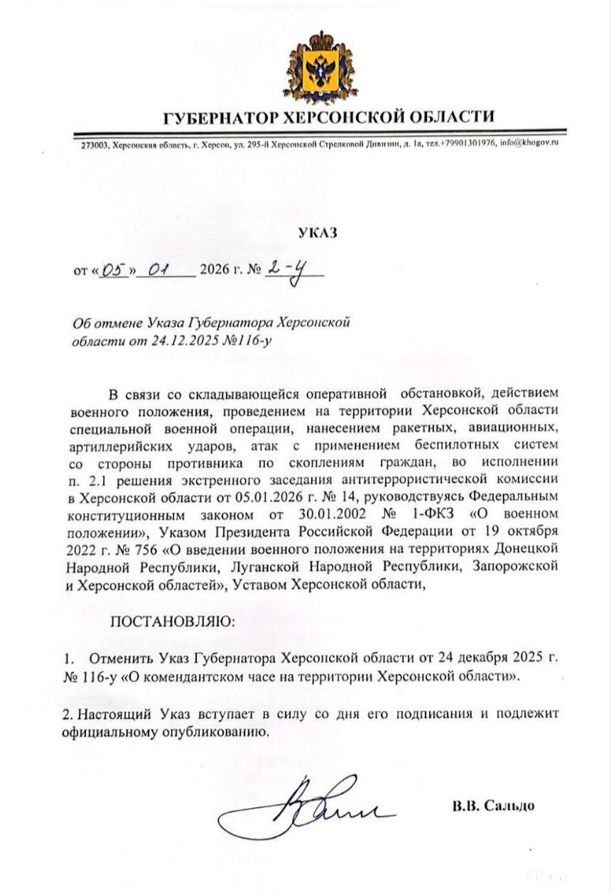 Комендантский час в Херсонской области в ночь с 6 на 7 января будет действовать в обычном режиме — с 23:00 до 04:00
