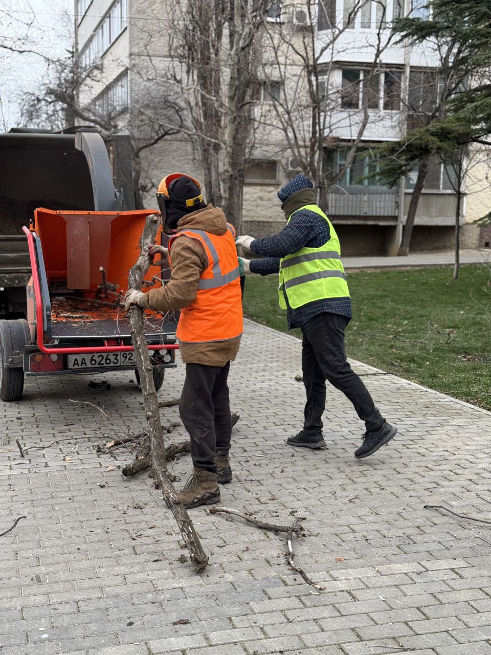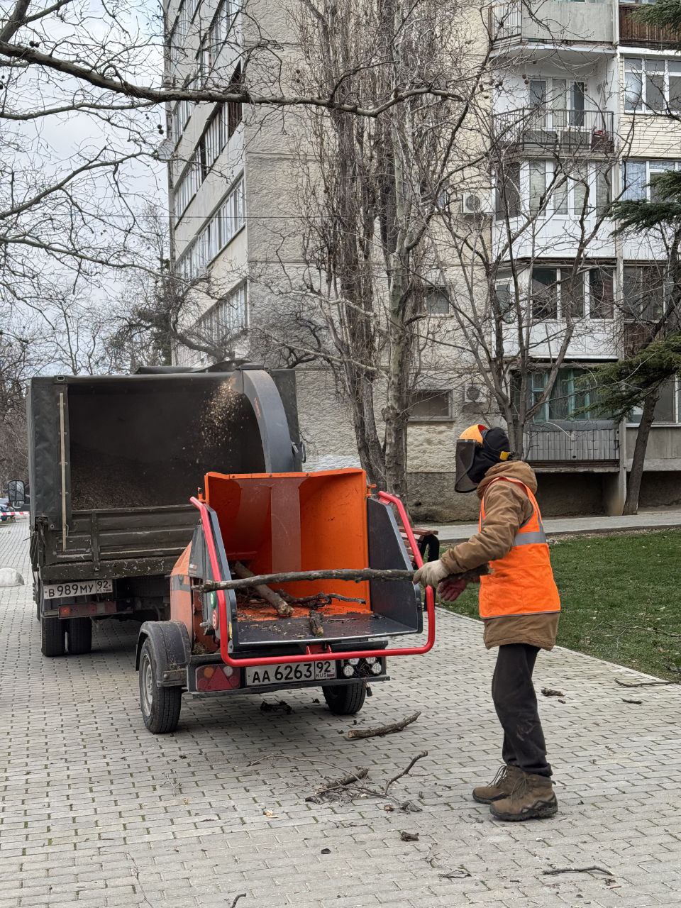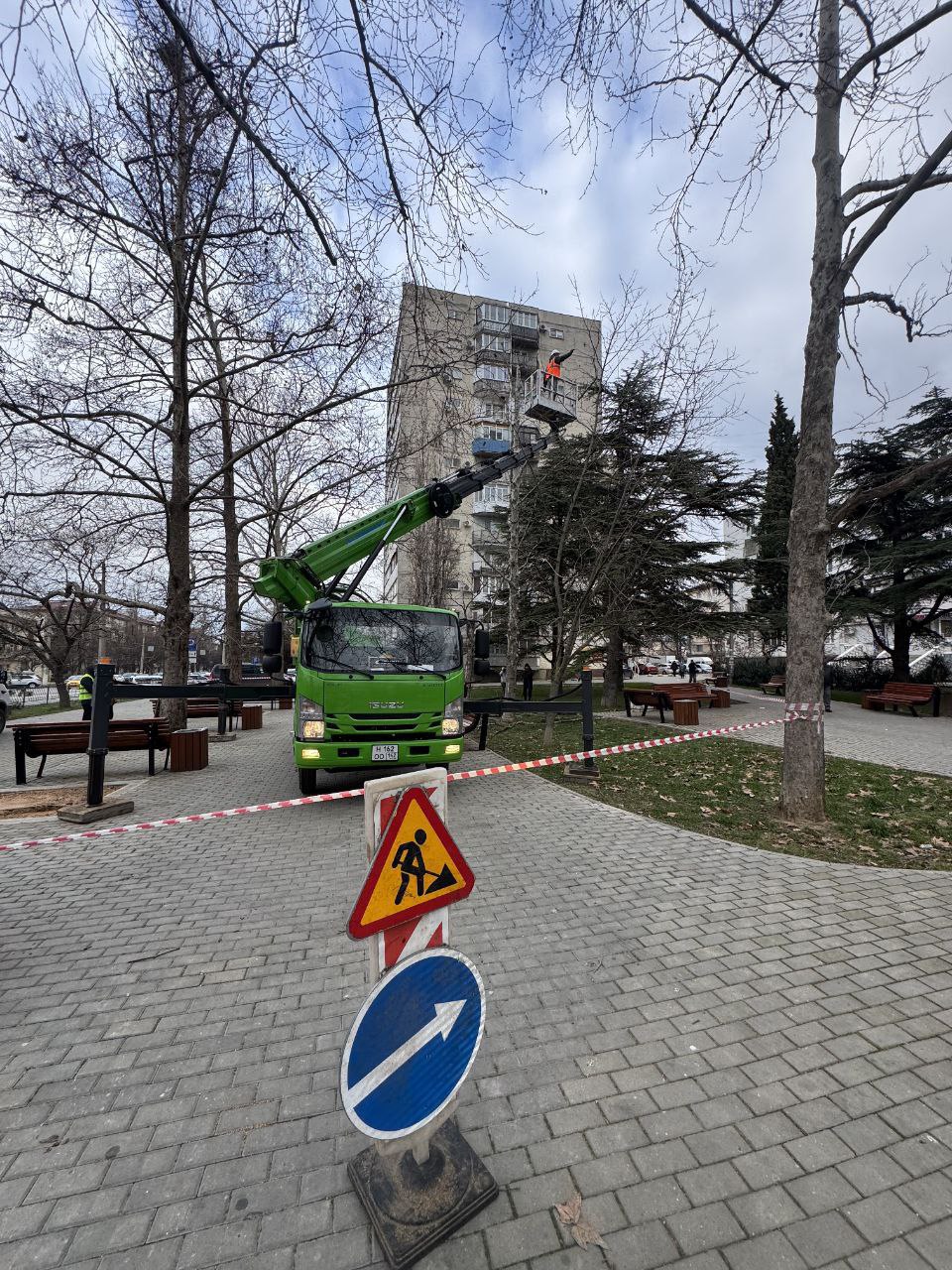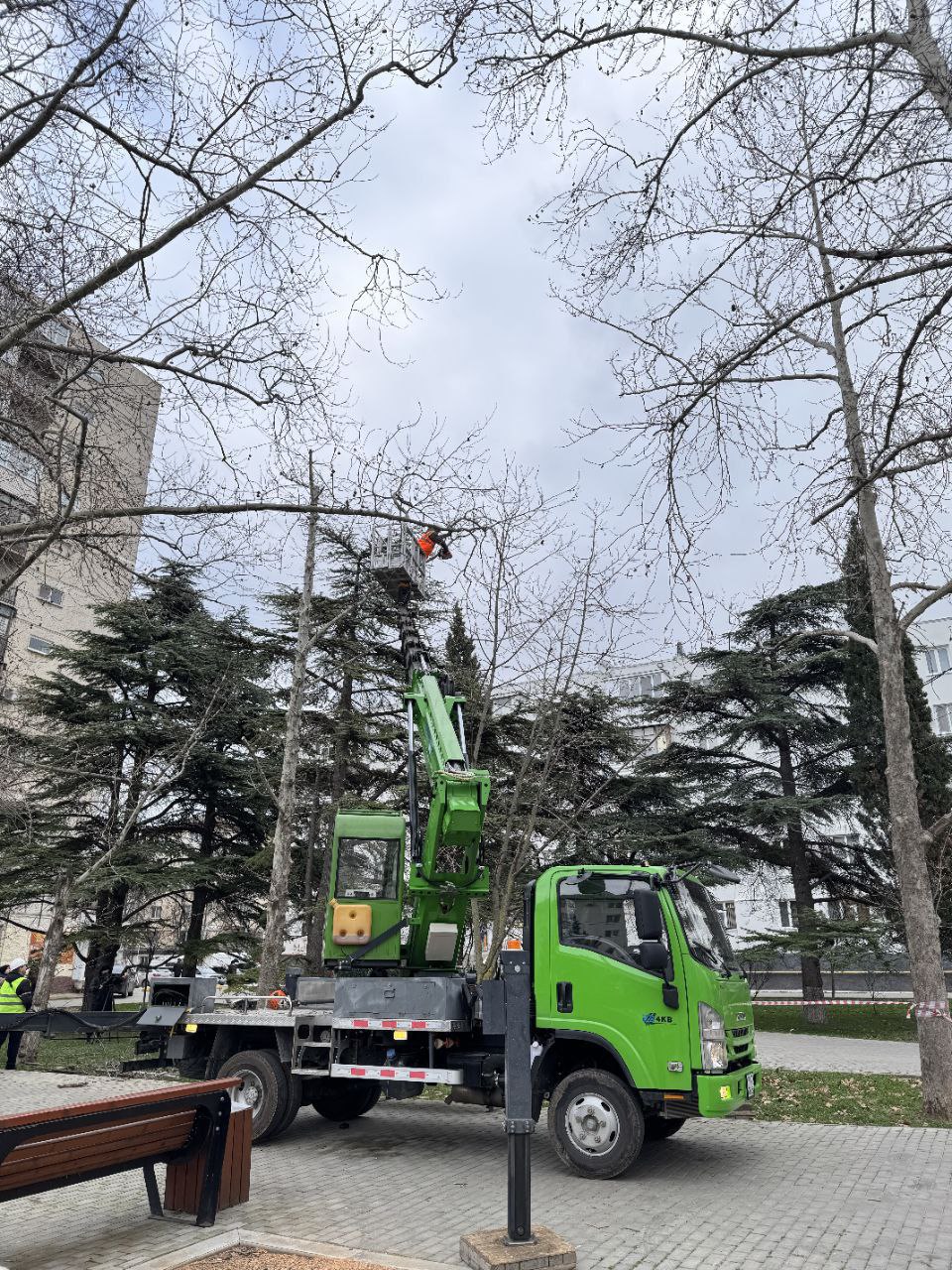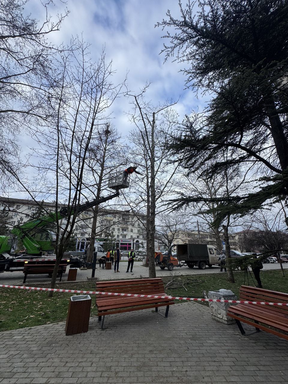 Сегодня в сквере около дома № 33 на проспекте Генерала Острякова была проведена обрезка сухих веток семи платанов