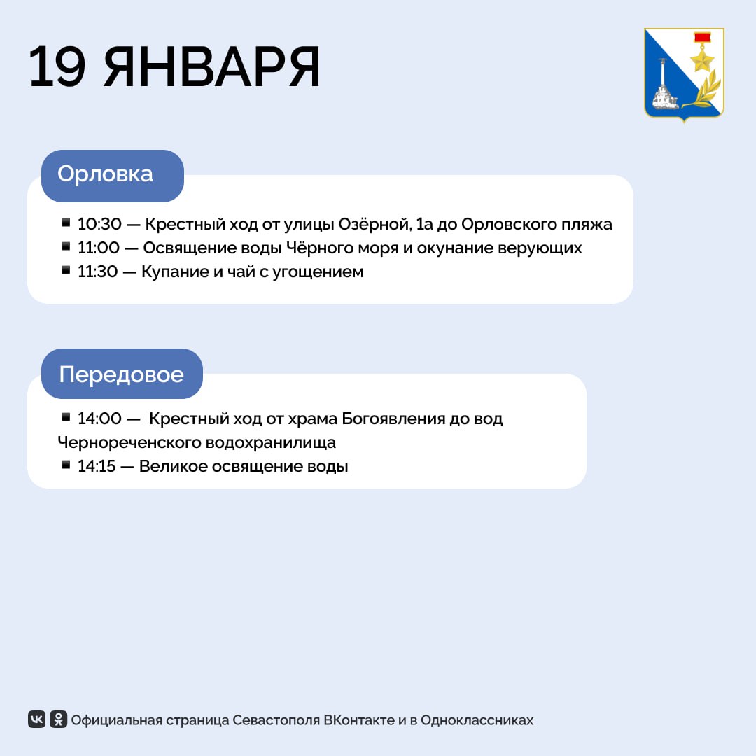Освященную воду можно будет взять в Свято-Владимирском соборе 18 и 19 января с 12:00 и в «Новом Херсонесе» у реки Героон 19 января с 12:00.
