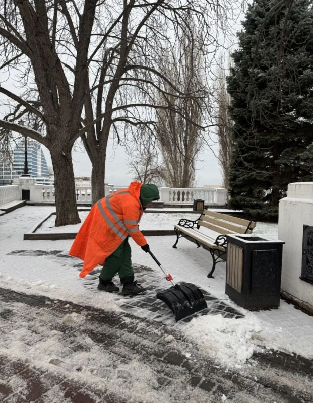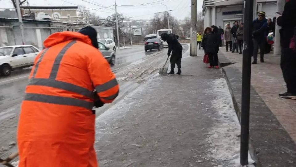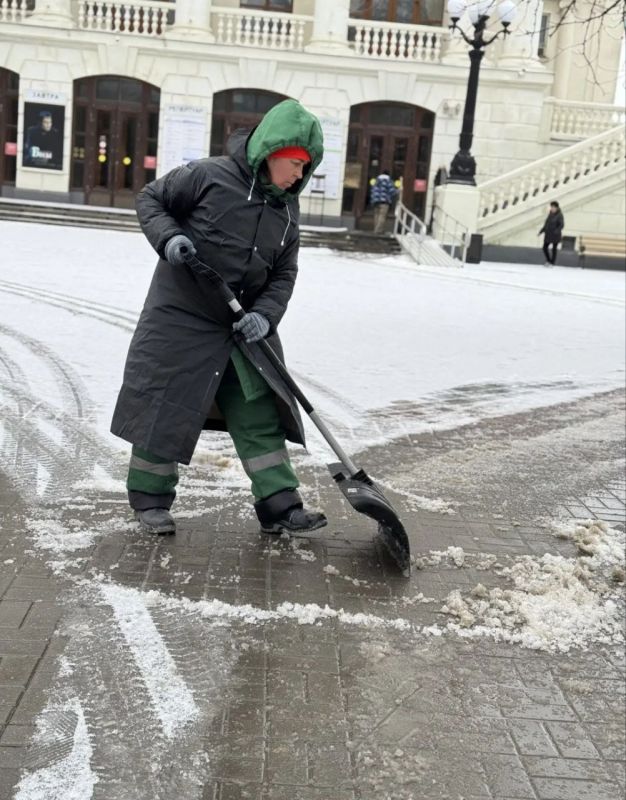 Рабочие бригады проводят расчистку пешеходных зон и тротуаров от снега, а также обработку посыпочным материалом для обеспечения безопасности пешеходов.