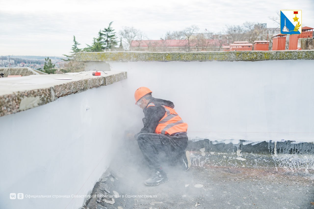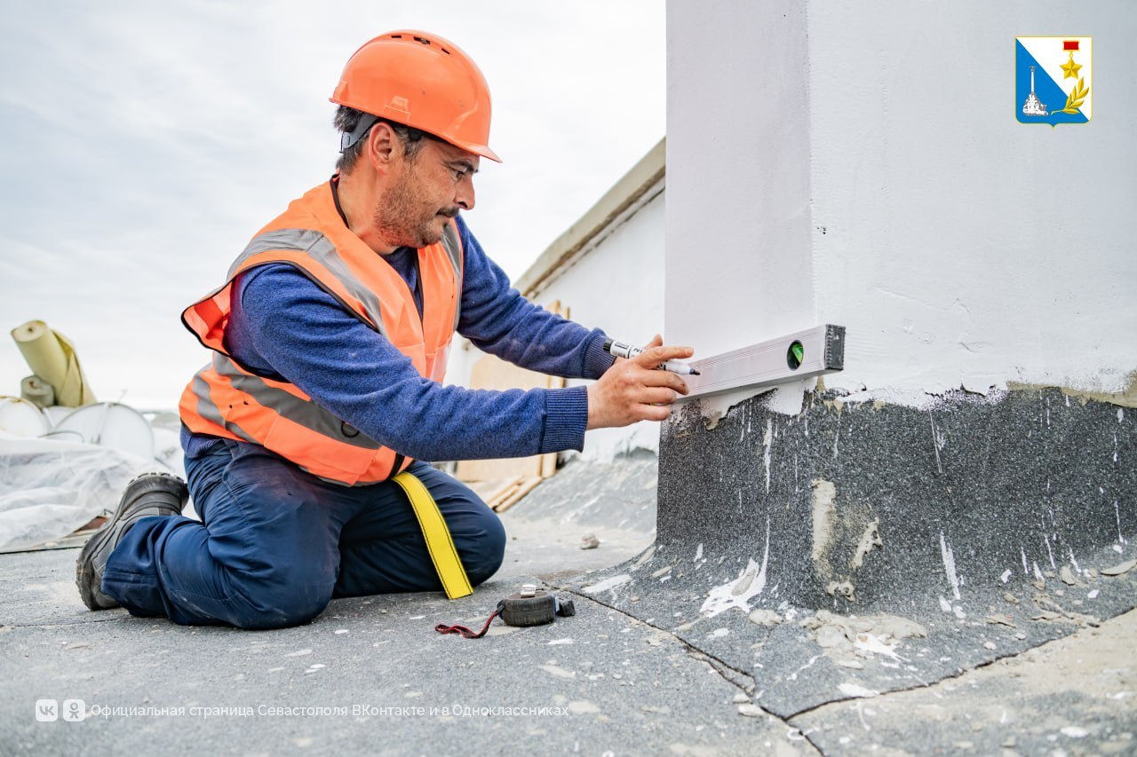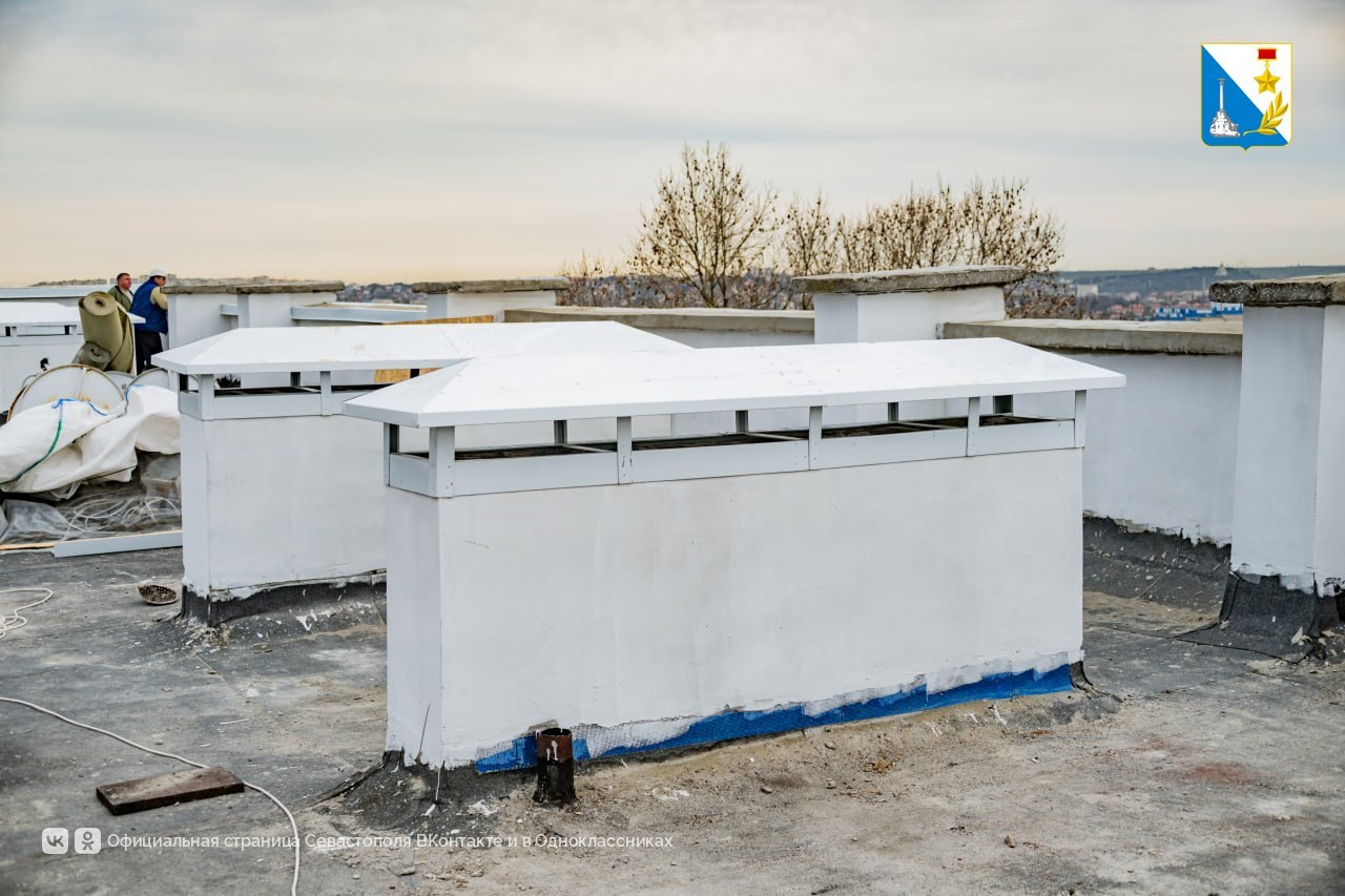 Перед обновлением демонтировали старые металлические элементы и мелкие детали кровли. Одновременно ремонтируют парапеты по периметру и меняют внутреннюю водосточную систему, приступают к укладке геотекстиля и монтажу ПВХ-мембраны.