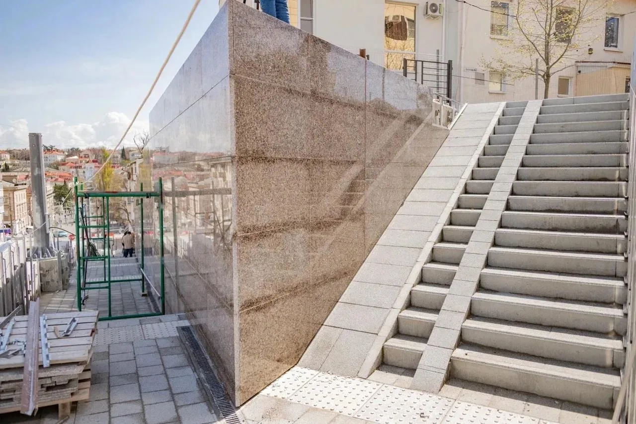 облицовывают верхние части подпорных стен южно-султаевским гранитом – уже готово 45%;