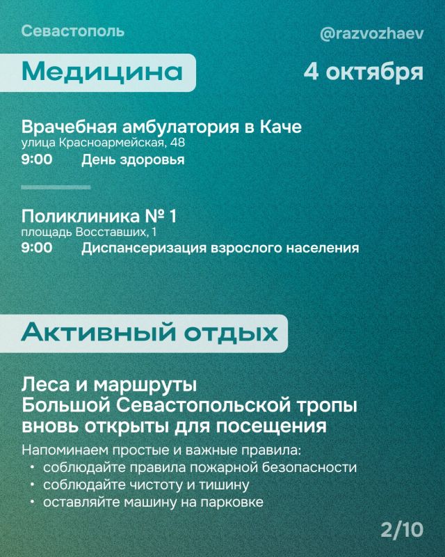 Севастопольские леса и маршруты Большой севастопольской тропы вновь открыты для посещения. Находясь в лесу, помните о простых правилах: соблюдайте чистоту, тишину и меры пожарной безопасности, оставляйте машину на парковке — проезд и стоянка транспорта в лесу запрещены. Берегите природу!