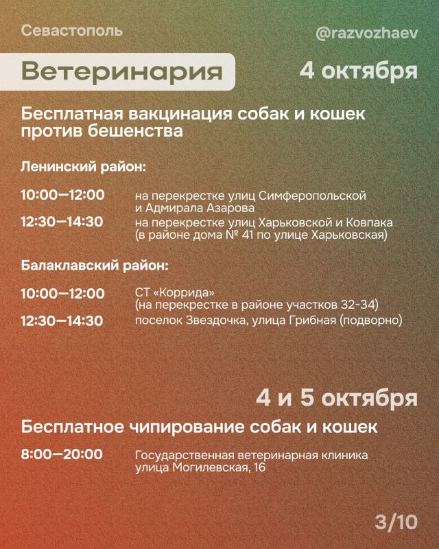 Ветеринары снова проведут выездную вакцинацию собаки кошек против бешенства. В эту субботу специалисты государственной ветслужбы будут работать в Ленинском и Балаклавском районе. По-прежнему в ветклинике на улице Могилёвской, 16 все желающие могут провести своим питомцам процедуру чипирования. Она занимает всего несколько минут, а чип даст возможность беспрепятственно путешествовать с питомцем, участвовать в международных выставках и облегчит поиск, если любимец потеряется.
