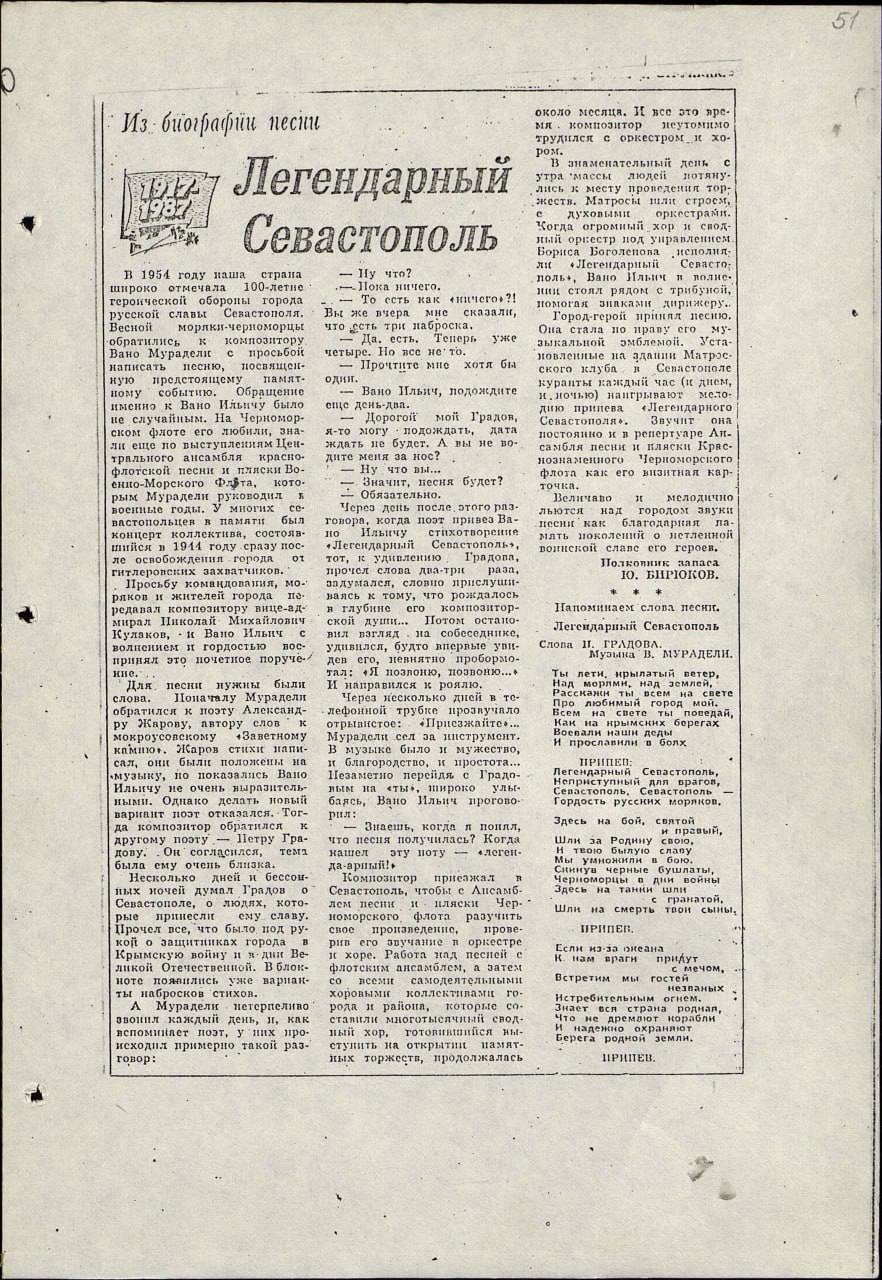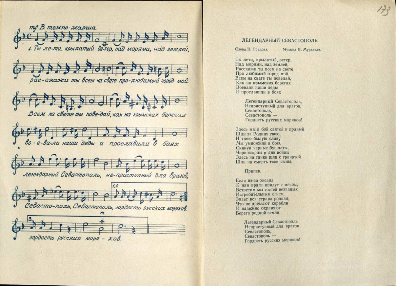 Специально для создания этой песни из Москвы приехал сам Вано Мурадели, а слова написал Пётр Градов. И когда 17 октября 1954 года на стадионе флота хор моряков и жителей города под управлением автора впервые исполнил «Легендарный Севастополь» под звуки сводного военного оркестра — это был настоящий триумф! Песня моментально покорила сердца, стала нашей, севастопольской.