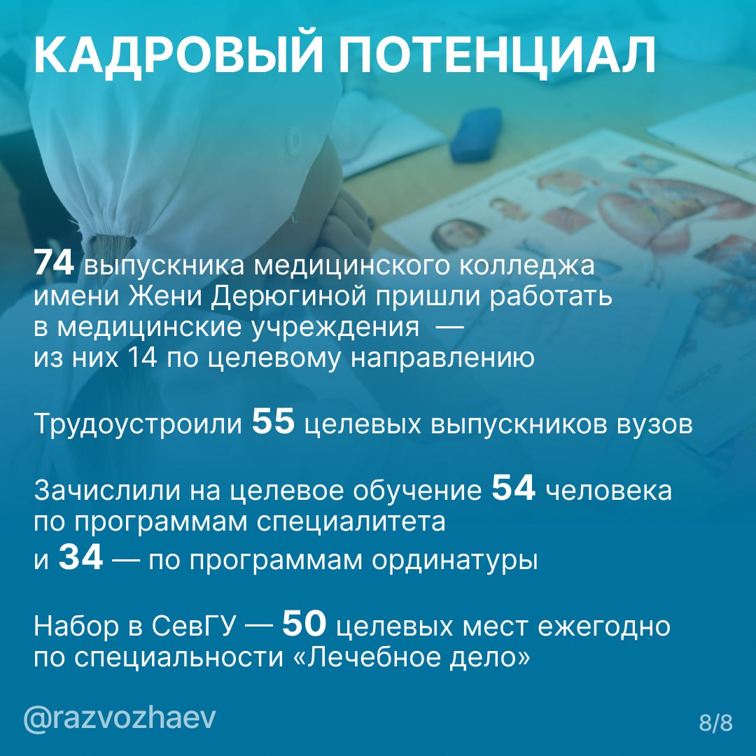 Продолжаем работу по привлечению медицинских кадров — это одна из наших ключевых задач. В этом году в медицинские учреждения пришли работать 74 выпускника медицинского колледжа имени Жени Дерюгиной, из них 14 по целевому направлению. А также мы трудоустроили 55 целевых выпускников вузов. На целевое обучение зачислили 54 человека по программам специалитета и 34 — по программам ординатуры. В Институте фундаментальной медицины и здоровьесбережения СевГУ также учатся наши целевики по специальности «Лечебное дело»: по окончании обучения они придут работать в городские больницы и поликлиники.