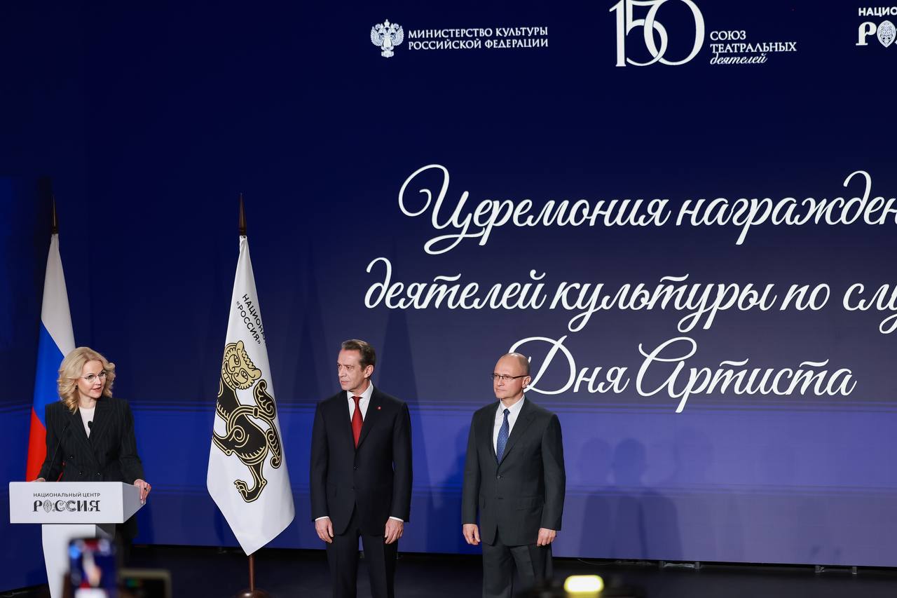 Первый заместитель руководителя администрации Президента Сергей Кириенко, вице-премьер Татьяна Голикова и председатель Союза театральных деятелей России Владимир Машков дали старт празднованию 150-летия Союза театральных деятелей. Мероприятие прошло в Национальном центре «Россия». Оно приурочено к профессиональному празднику – Дню артиста.