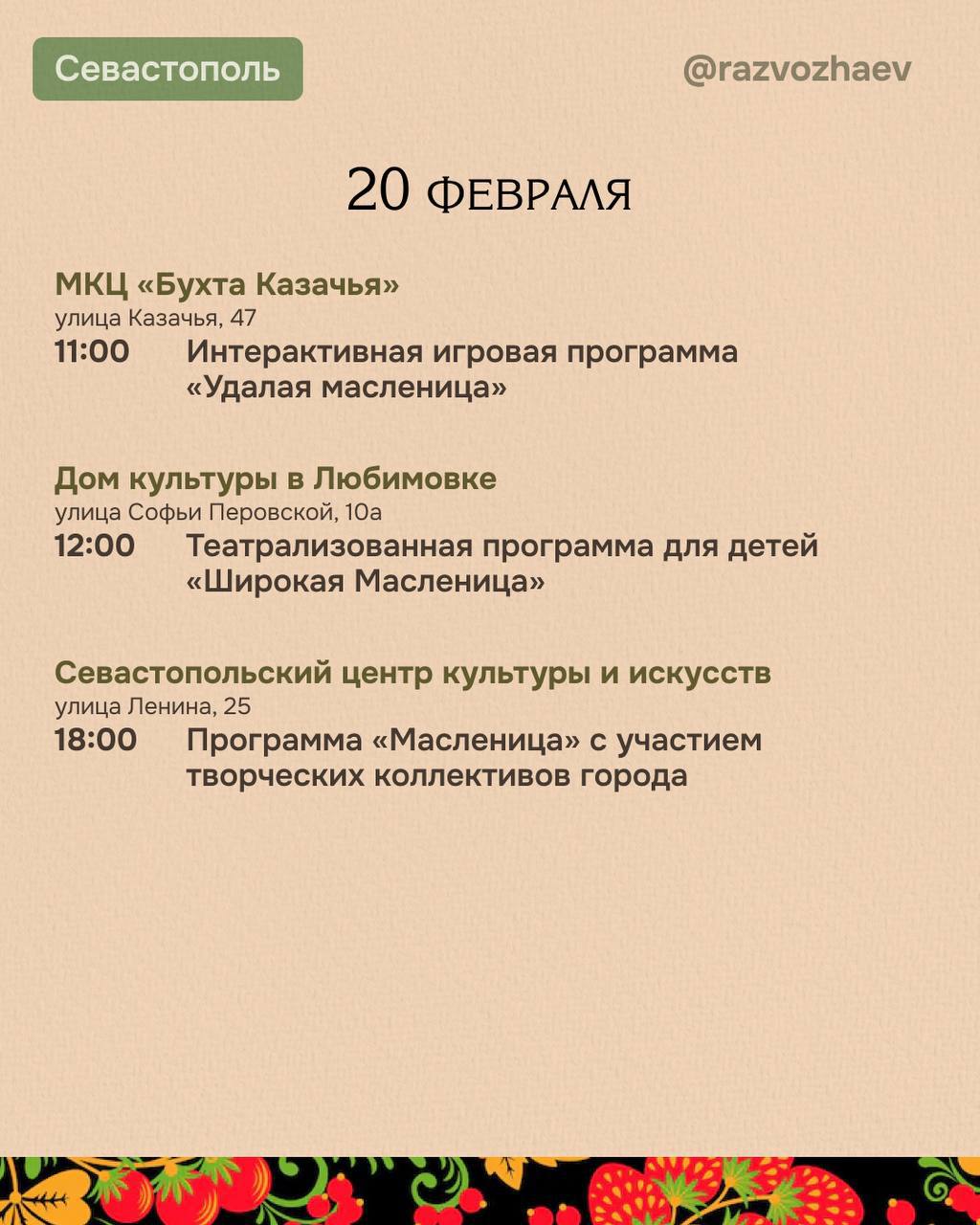 Завтра начнётся Масленица — один из самых древних и любимых праздников в русской культуре, который символизирует проводы зимы и долгожданную встречу весны. К празднику городские учреждения подготовили насыщенную программу. Публикую расписание мероприятий: воскресенье — отличное время, чтобы спланировать будущую неделю!