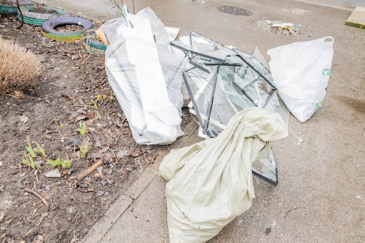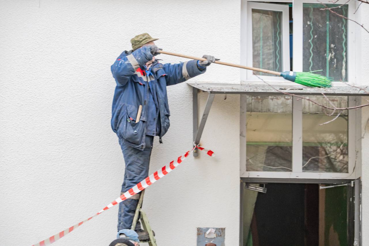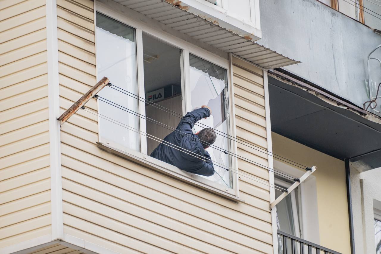 На кадрах работа специалистов УК «Центр» в домах на улице Гоголя. После осмотра саперов, собирают обломки. Окна временно затягивают пленкой, в последующем окна будут менять.
