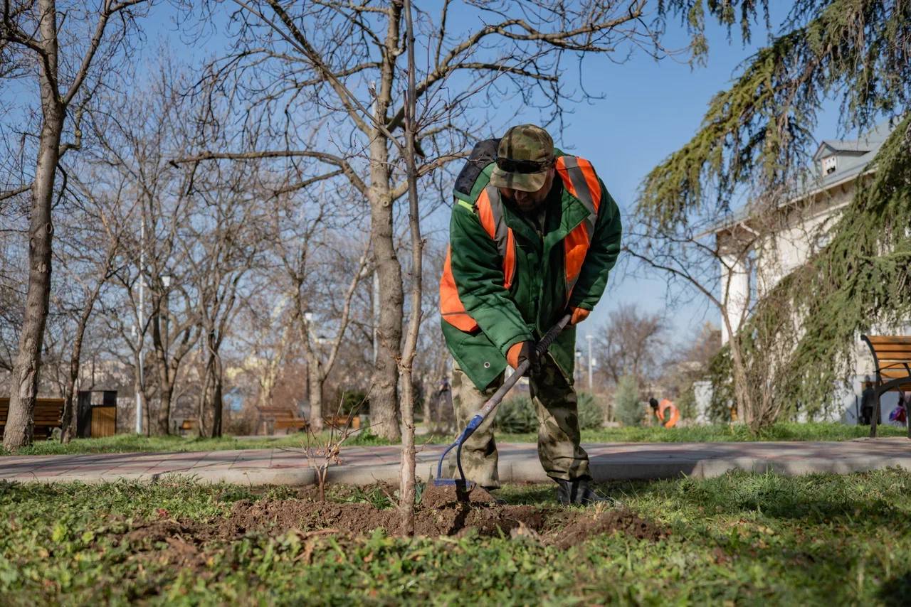 Несколько дней специалисты будут формировать приствольные лунки, чтобы после полива влага задерживалась у корневой системы растений, а не растекалась по территории. Это повышает эффективность полива и хорошо влияет на корни.
