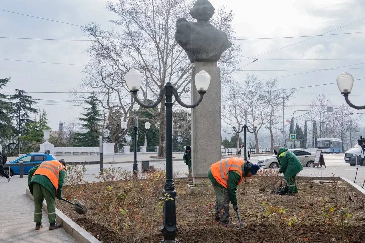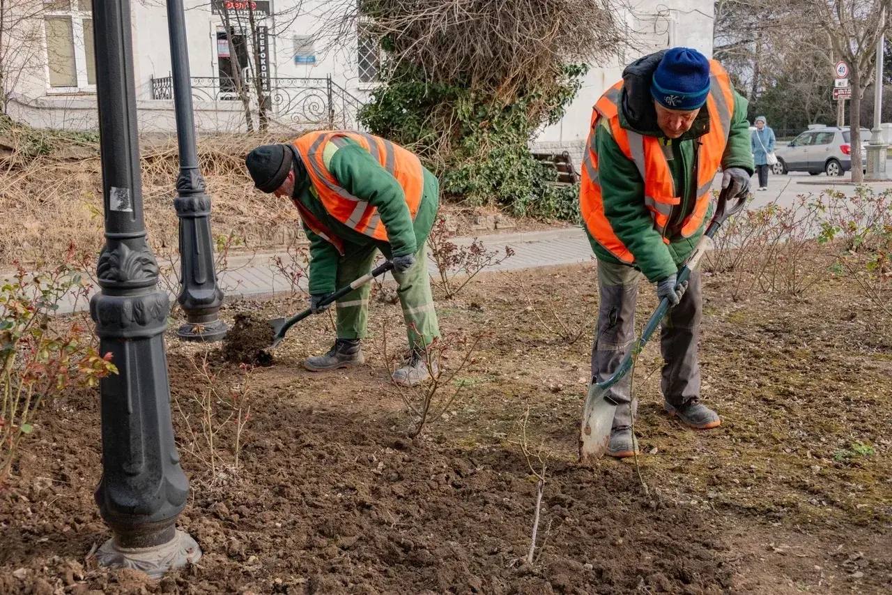 На площади Суворова, у памятника полководцу, уже начались плановые работы по уходу за розарием. Специалисты убирают лишние и слабые побеги, чтобы растения не тратили силы зря — тогда бутоны вырастут крупными и здоровыми. А ещё рыхлят землю: так корни получают больше кислорода и влаги.