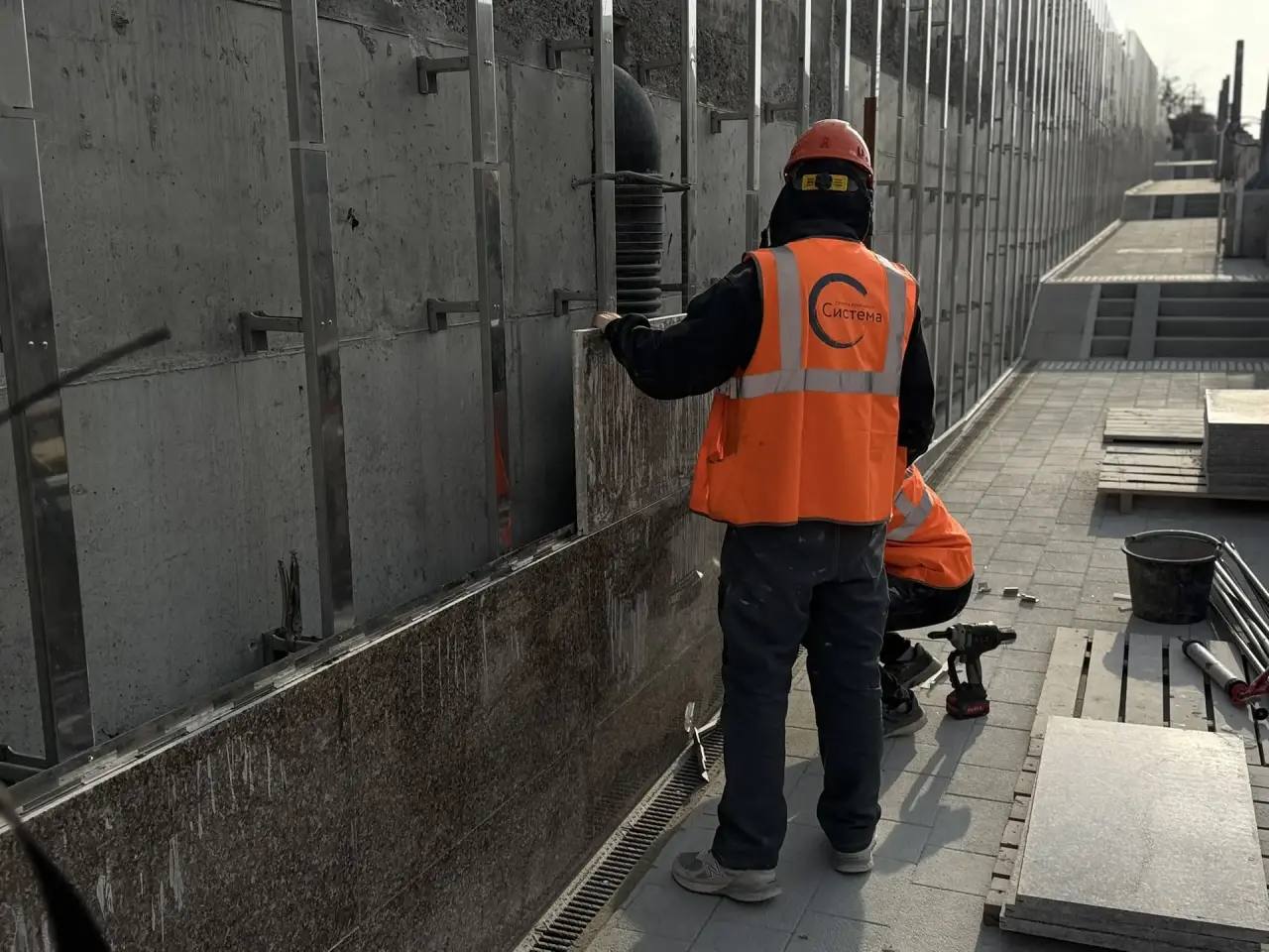 Подрядчик приступил к облицовке верхних фасадов подпорных стен — их суммарная площадь 2800 квадратов. Уже готово около 10% покрытия из южно-сутлаевского гранита. Параллельно ведётся укладка плитки на лестничных сходах.