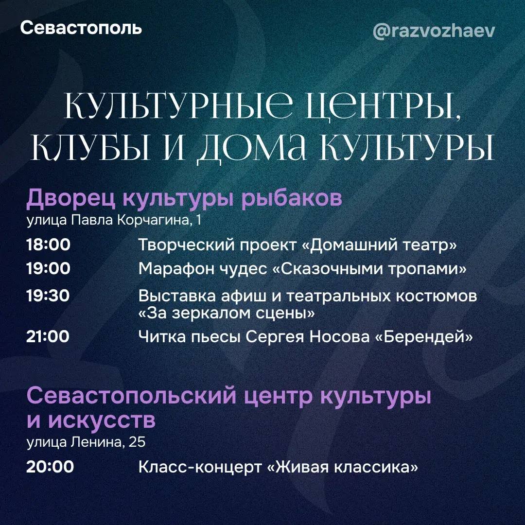 Насыщенная программа ждёт севастопольцев и во Дворце культуры рыбаков, а Севастопольский центр культуры и искусств подготовил класс-концерт «Живая классика».