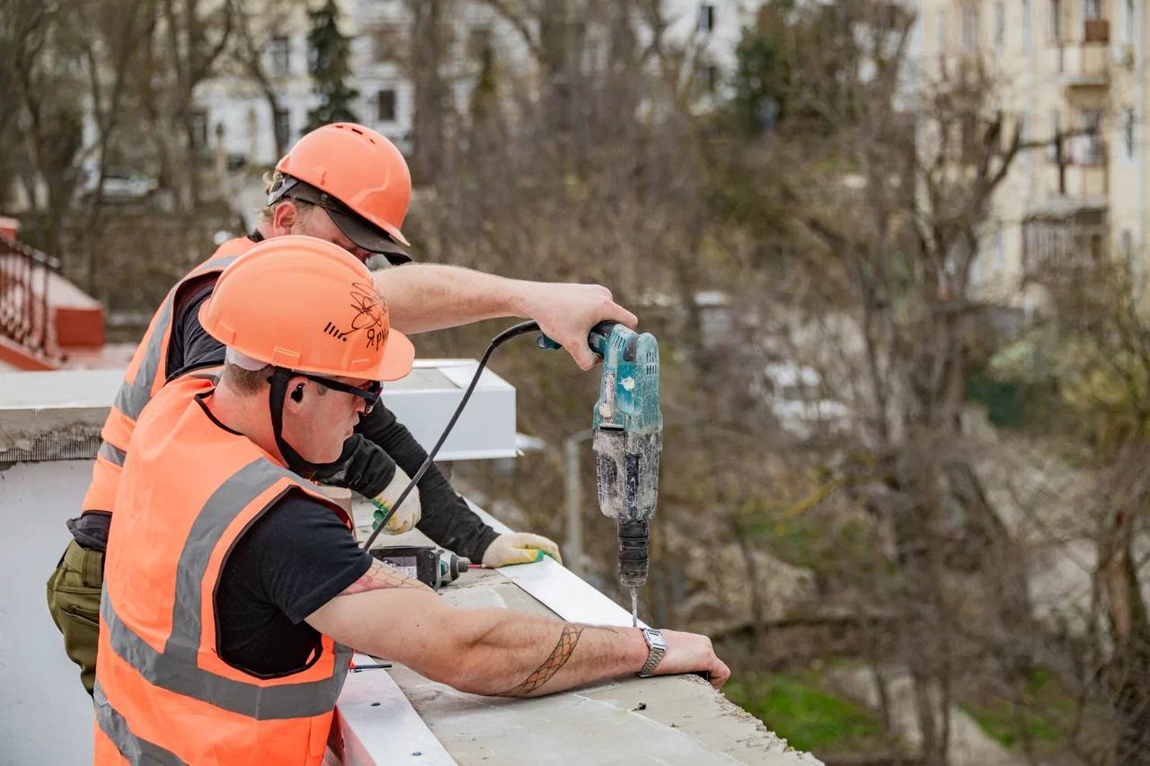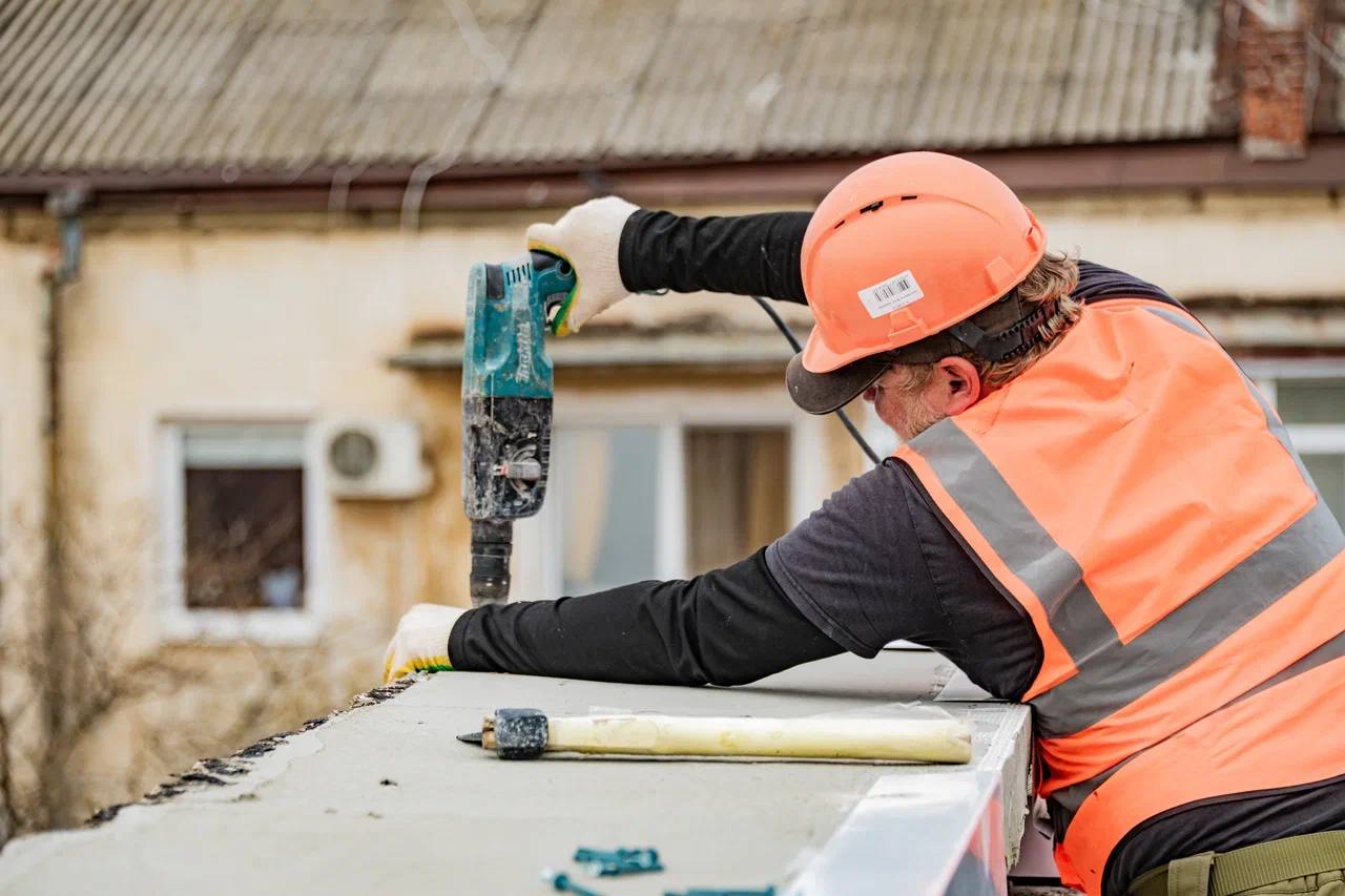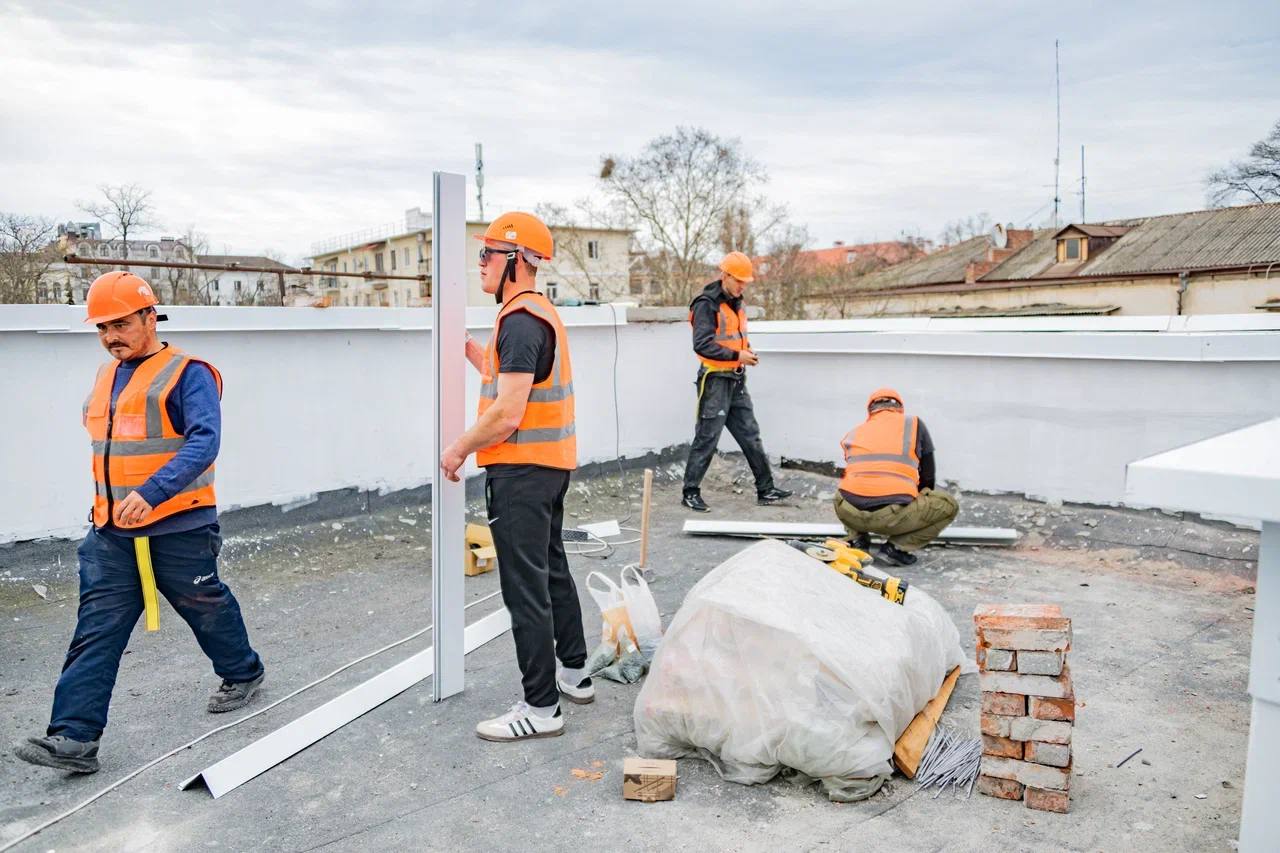 Сейчас на объекте уже демонтированы старые металлические элементы, примыкания и изношенные участки кровли. Параллельно ведётся ремонт парапетов по периметру и замена внутренней водосточной системы.