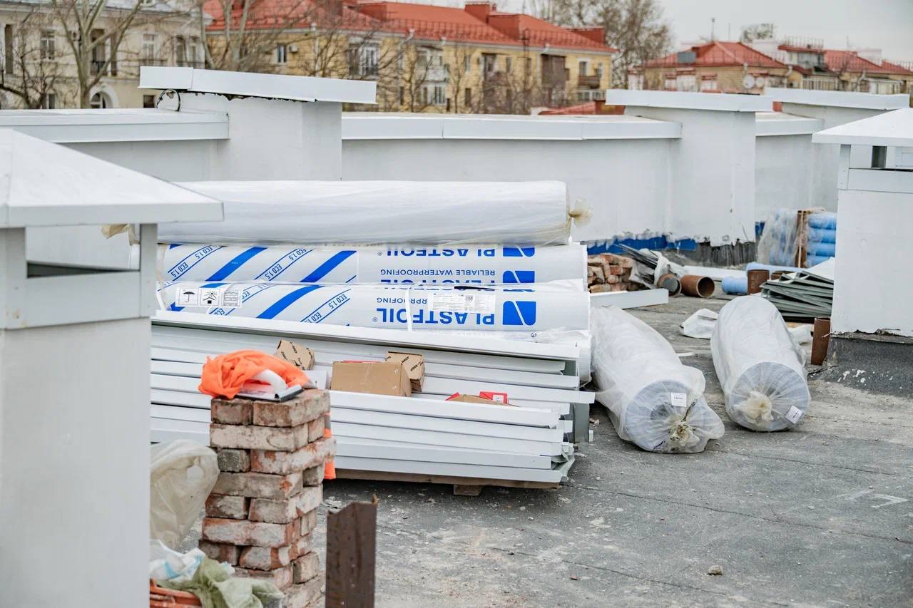 Далее строители приступят к укладке геотекстиля и монтажу ПВХ-мембраны, все необходимые материалы уже доставлены. После этого выполнят устройство примыканий, установят аэраторы для вентиляции подкровельного пространства, смонтируют трубостойки и заменят выход на кровлю на противопожарный люк с доводчиком.