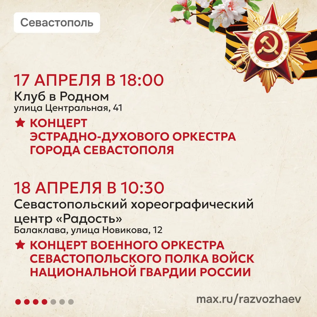С 14 апреля по 12 мая концерты пройдут в Вишнёвом, Орлином, Солнечном, Родном, Балаклаве, Инкермане, Любимовке, Верхнесадовом и Севастополе. Вход на все мероприятия свободный.