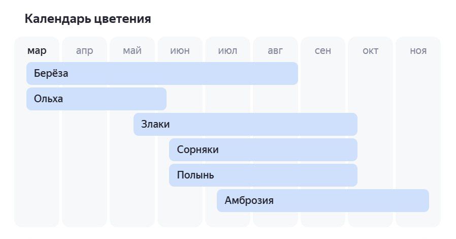 Яндекс.Погода решила, что нам мало просто знать, будет ли дождь или солнце. Там запустили сервис для страдающих сезонной аллергией. Теперь вы можете узнать, что именно будет цвести в ближайшее время и как сильно это испортит вам жизнь. Потому что, как говорится, предупрежден — значит вооружен.