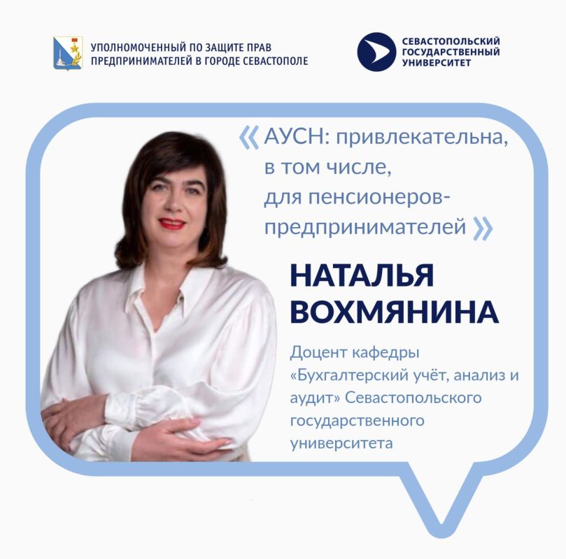 Доцент кафедры «Бухгалтерский учёт, анализ и аудит» Севастопольского государственного университета Наталья Вохмянина отметила, что АУСН —привлекательна, в том числе, для пенсионеров-предпринимателей.