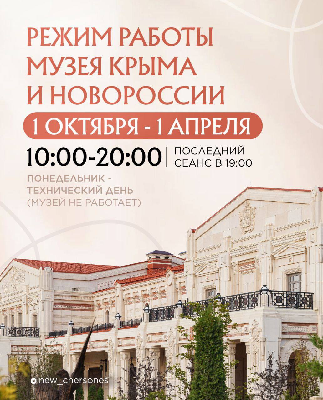 Музей Крыма и Новороссии: с 10:00 до 20:00 (вход возможен до 19:00), понедельник — технический день.