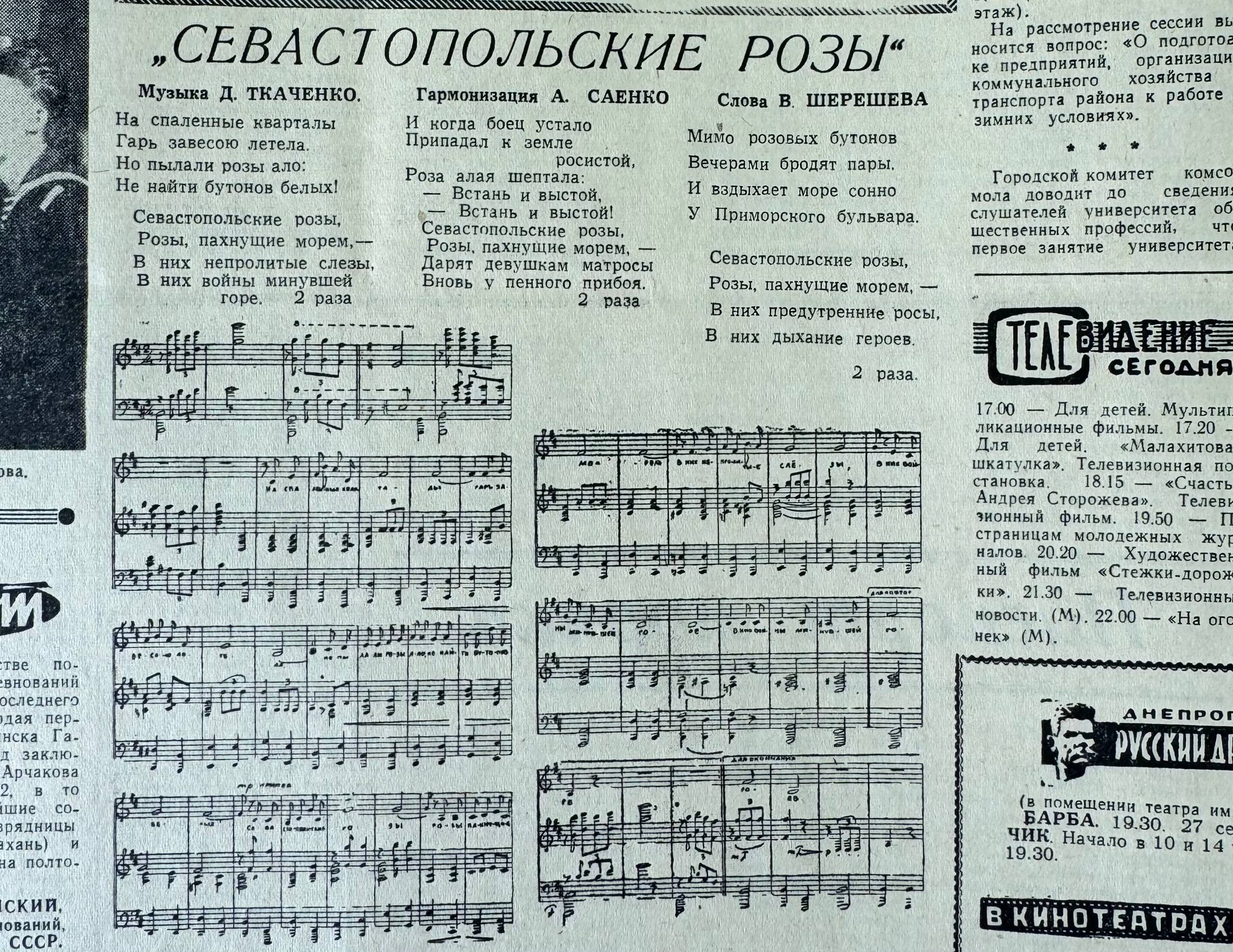 В честь праздника делимся вырезкой из газеты «Слава Севастополя» за октябрь 1965 года со словами и музыкой песни «Севастопольские розы».