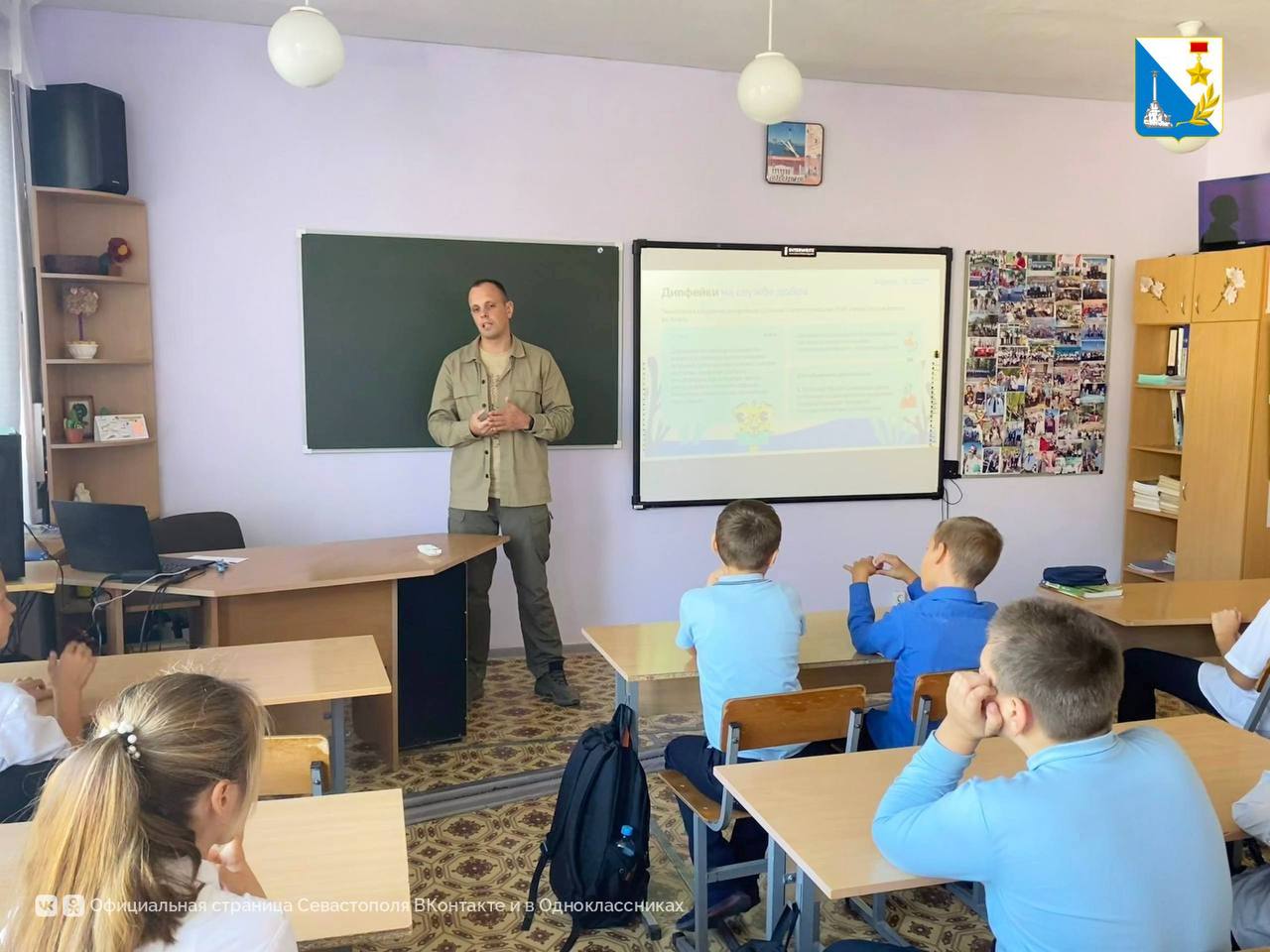 Перед учениками также выступил ветеран СВО и участник программы «Севастополь — город героев» Алексей Унинский — он подчеркнул важность критического восприятия информации и умения отличать достоверный контент от цифровых подделок.