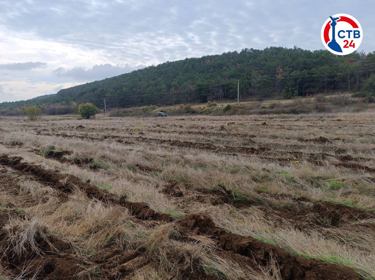 Спецтехника — однозубый рыхлитель, врезается в почву на глубину 60 сантиметров, чтобы разбить твёрдые слои грунта и позволить земле напитываться влагой перед посадкой.