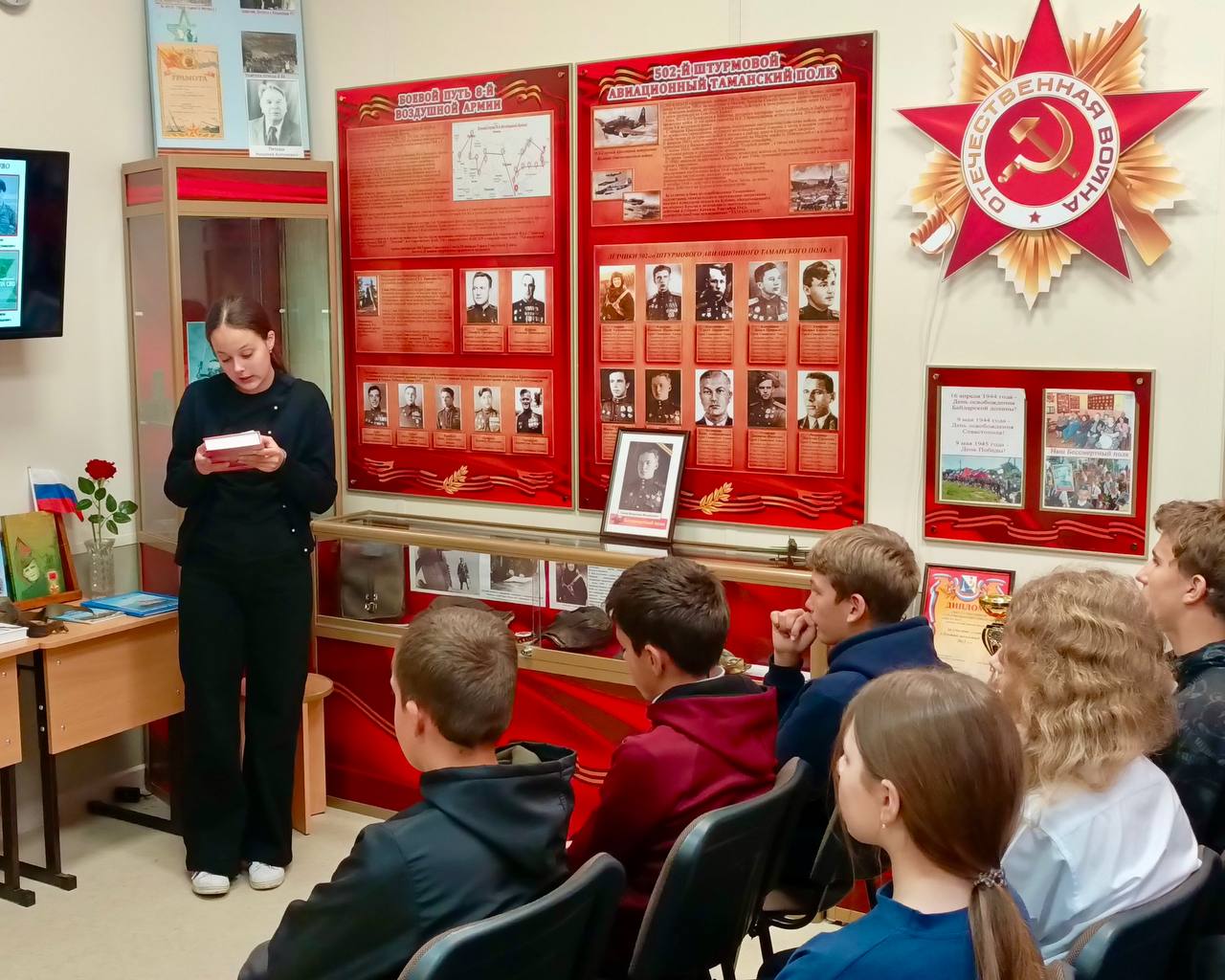 Главной темой встречи стала память о выпускниках школы — участниках СВО. Руководитель музея представила экспозицию, рассказала о Героях, показала их фотографии и зачитала отрывки из книги «Живые! Помните о нас».